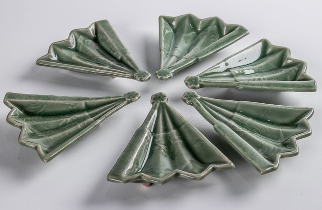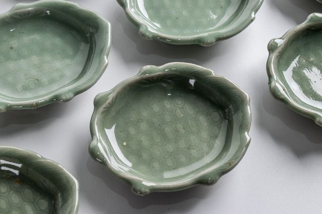 三田青磁 扇面陰刻山水文小皿 豆皿 6客 E2274