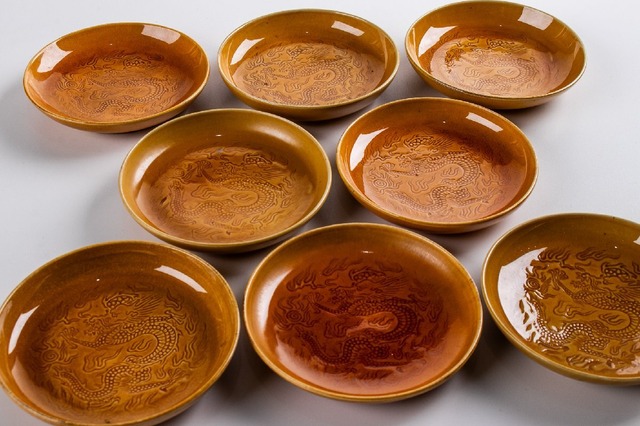 淡路焼 民平焼 黄釉陰刻雲龍文小皿 7客 F164A バラ売り可能です