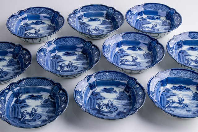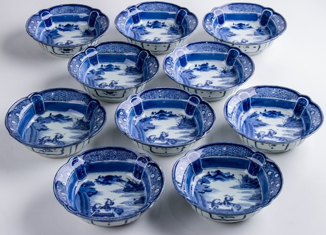 古伊万里 染付白抜き山水人物文平鉢 10客 江戸後期 E2001B バラ売り可能です