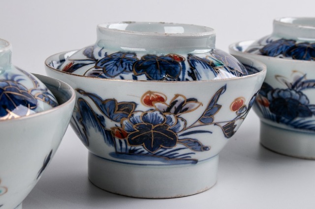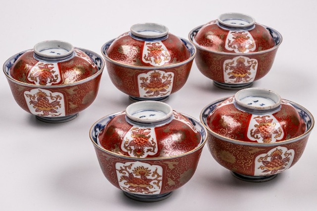 【うつわ】 古伊万里 染錦唐華文蓋茶碗 5客 明治時代 E468B バラ売り可能です