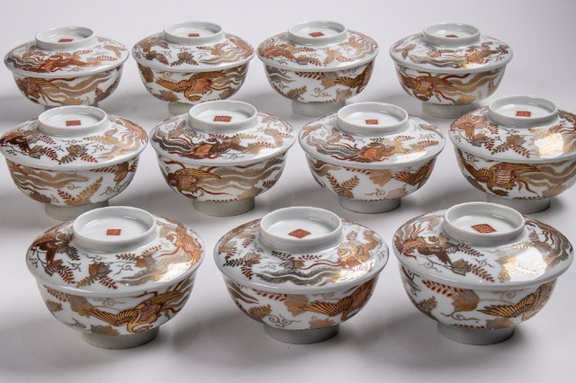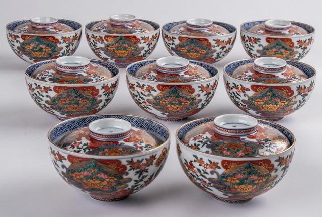 大聖寺伊万里 金襴手更紗鳳凰文蓋茶碗 9客 明治時代 F151 バラ売り可能です