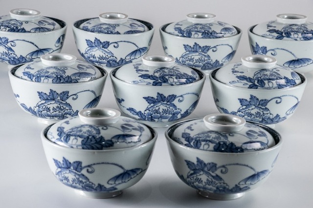 【うつわ】 古伊万里 染付線描き牡丹蝙蝠文蓋茶碗 9客 江戸後期 E029 バラ売り可能です