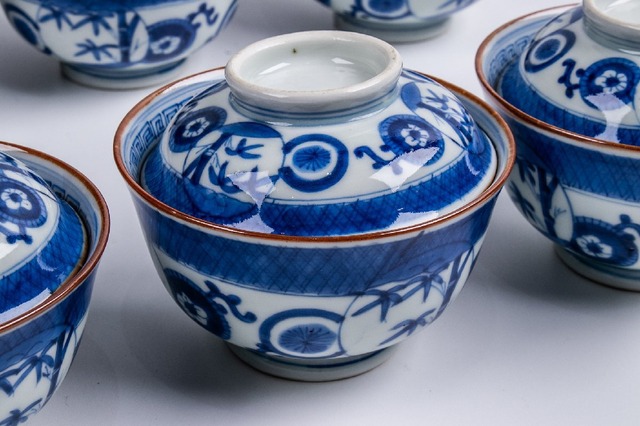 【うつわ】 古伊万里 染付竹林文蓋茶碗 10客 江戸後期 E1216B バラ売り可能です