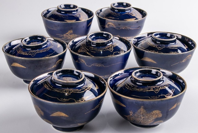 古伊万里 瑠璃釉金彩山水文蓋茶碗 7客 明治時代 F175F バラ売り可能です