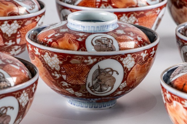 【うつわ】 古伊万里 染錦小槌鼠文蓋茶碗 5客 明治時代 E680B バラ売り可能です