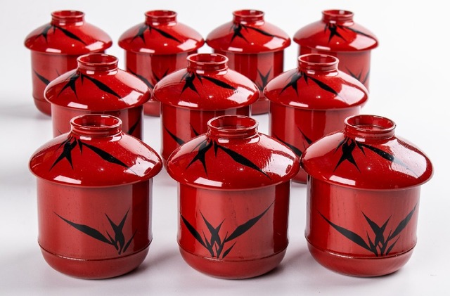 岡本漆専堂 朱松葉ノ絵 黒乱筋小吸物椀 10客 共箱 E2235