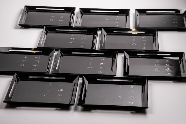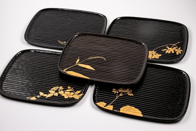 アソベ光石 黒漆草花絵替り蒔絵 折敷膳 5客 共箱 E1417