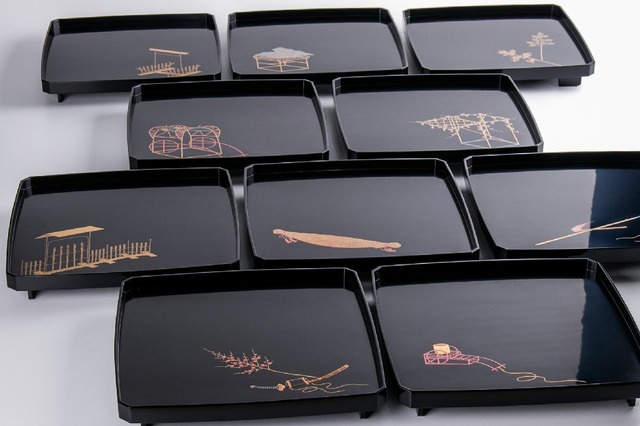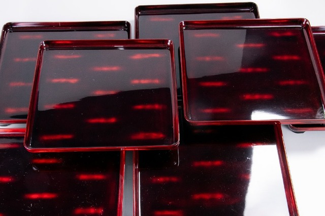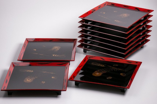 【うつわ】 縁根来塗 羽根研ぎ出し蒔絵 懐石膳 10客 箱付 E922