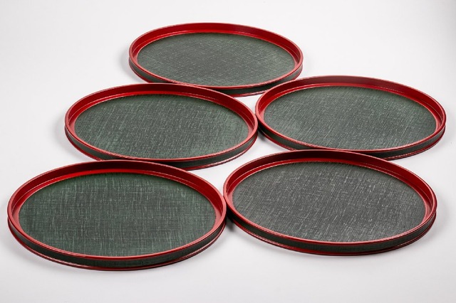 岡本漆専堂 瓜紅 布張青漆丸膳 5客 共箱 E1524