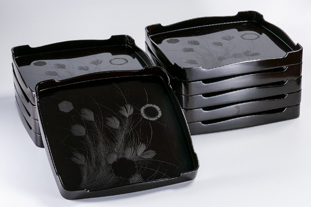 【うつわ】 輪島塗 毛彫尾花雪輪黒塗 懐石膳 10客 径36×36cm D672