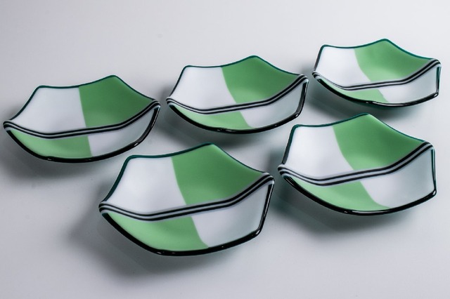 鍋田尚男 緑彩線文六角ガラス皿 5客 E2307