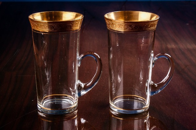 アンティーク フランス 金彩グラス ビールグラス 2客 ウランガラス 高さ13.8cm E2110A