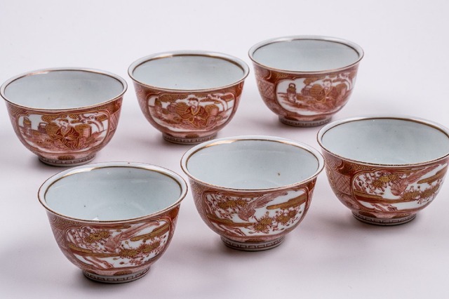 九谷 赤絵金彩煎茶図碗 6客 E1204