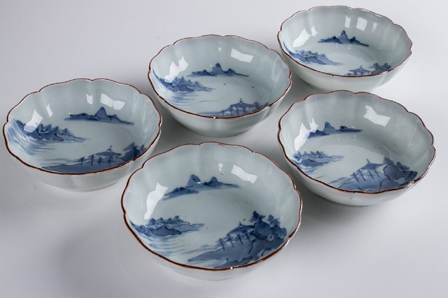 古伊万里 染付楼閣山水文なます皿 5客 明治時代 E1854B バラ売り可能です
