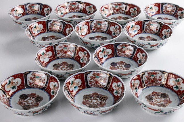 古伊万里 染錦柘榴七宝文輪花鉢 10客 明治時代 F138A バラ売り可能です