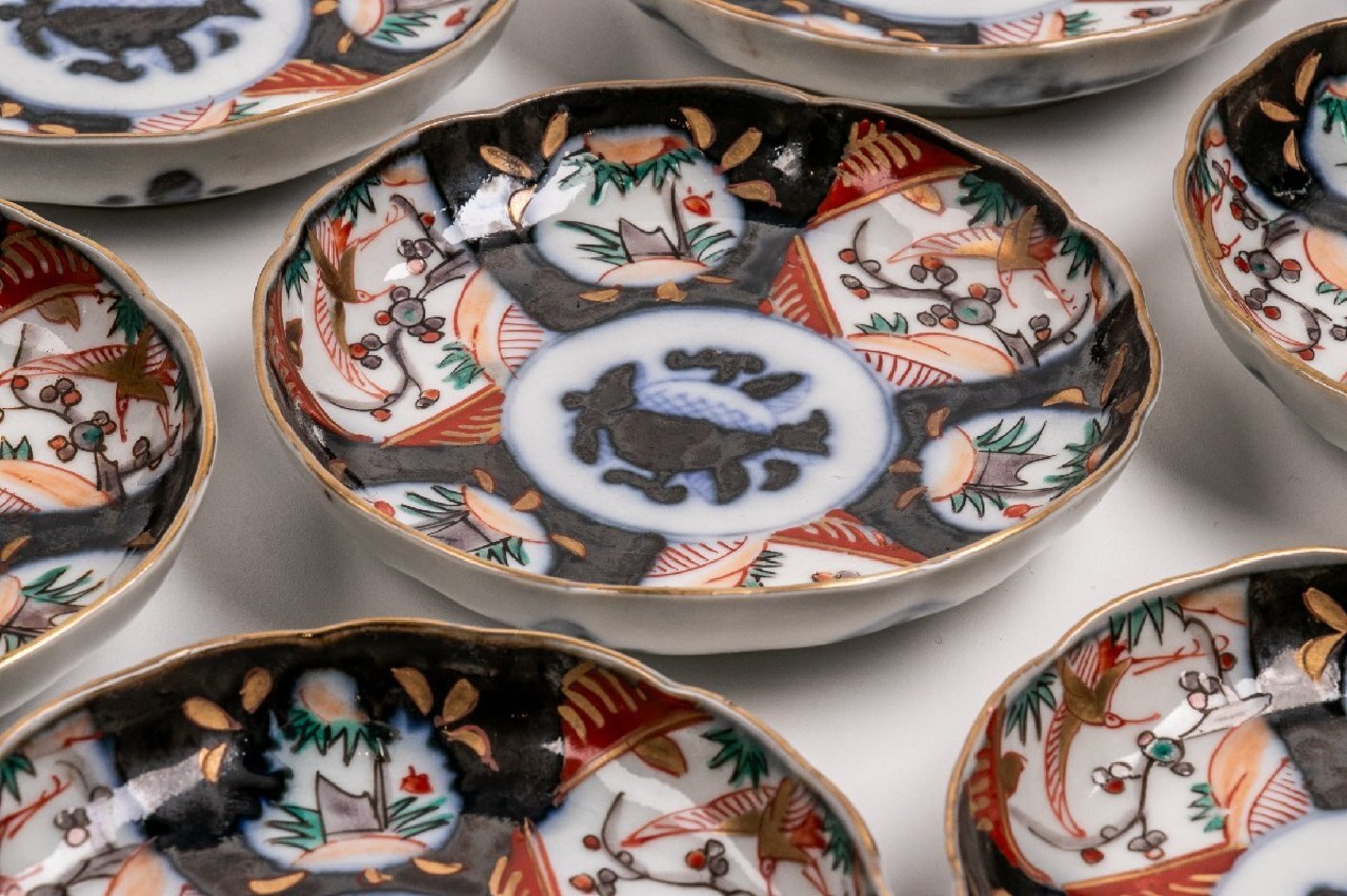 古伊万里 染錦竹梅鶴蟠桃文 四寸皿 10客 明治時代 E1796A バラ売り可能です