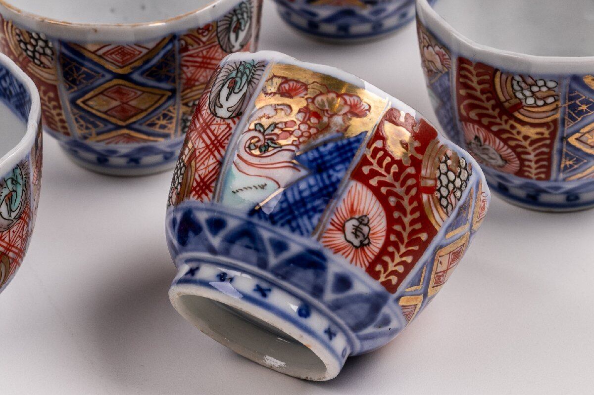 古伊万里 染錦草花鶴亀文碗 猪口 5客 明治時代 E1611 バラ売り可能です