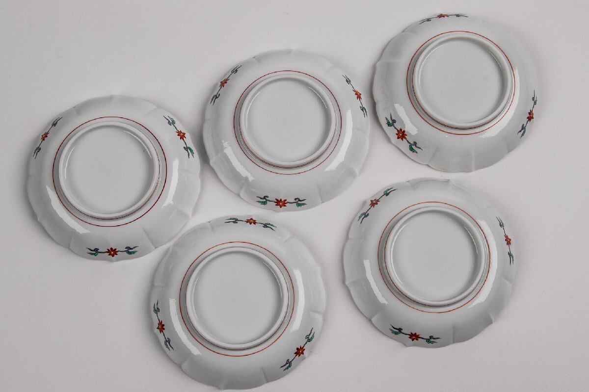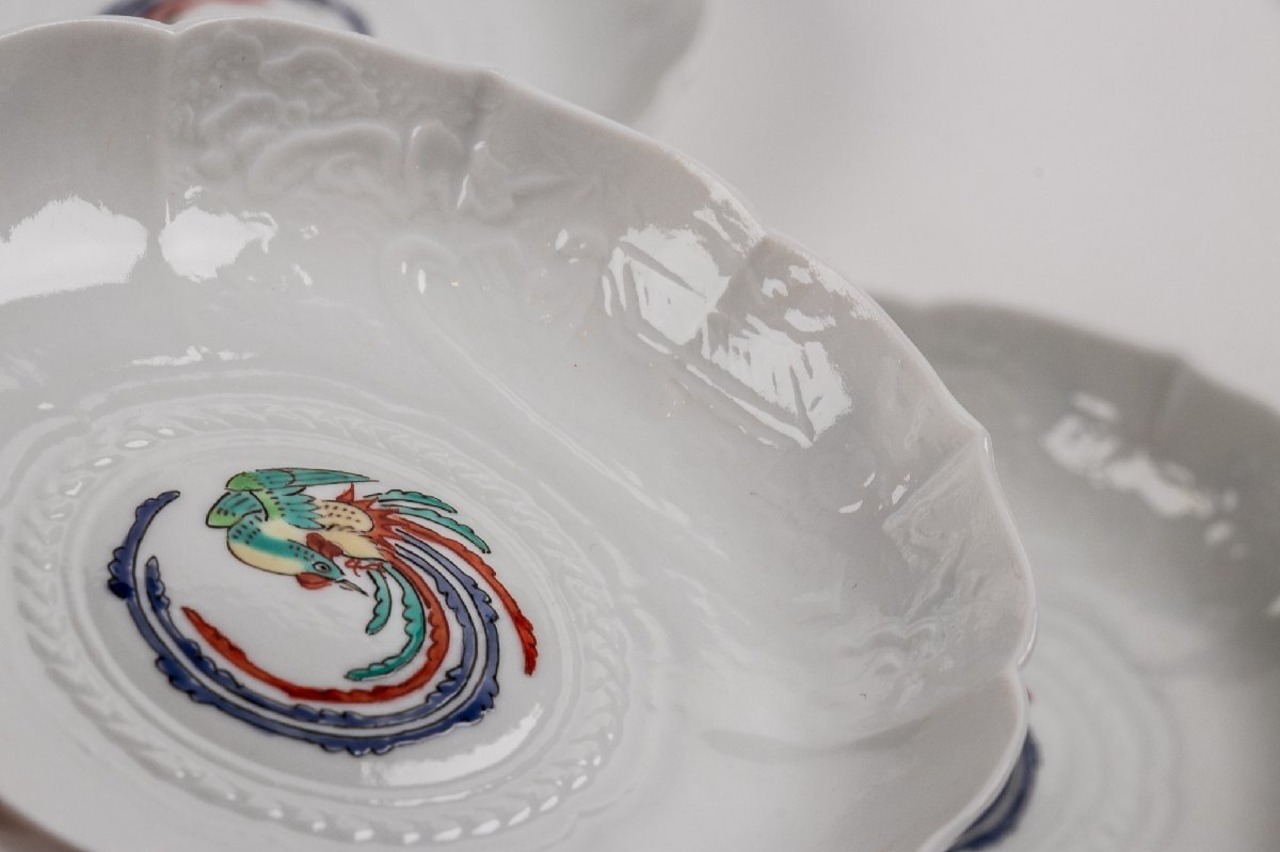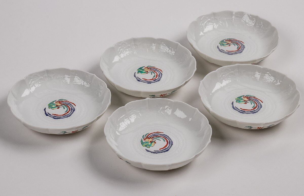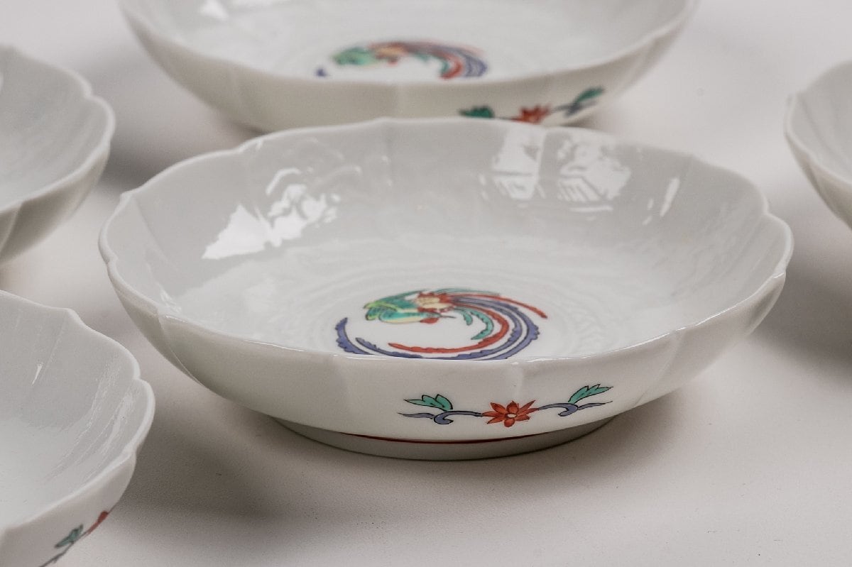 人間国宝 十四代 酒井田柿右衛門 本人作 濁手 鳳凰文皿 5客 共箱 E1643 陽刻輪花皿