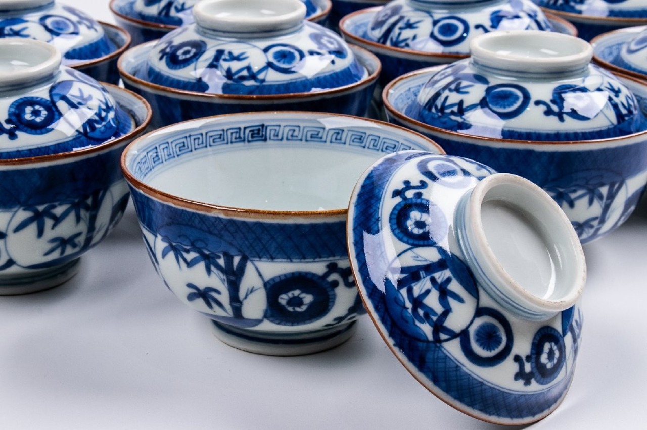 古伊万里 染付松竹梅丸文蓋茶碗 蓋物 4客 明治時代 E1797A バラ売り可能です