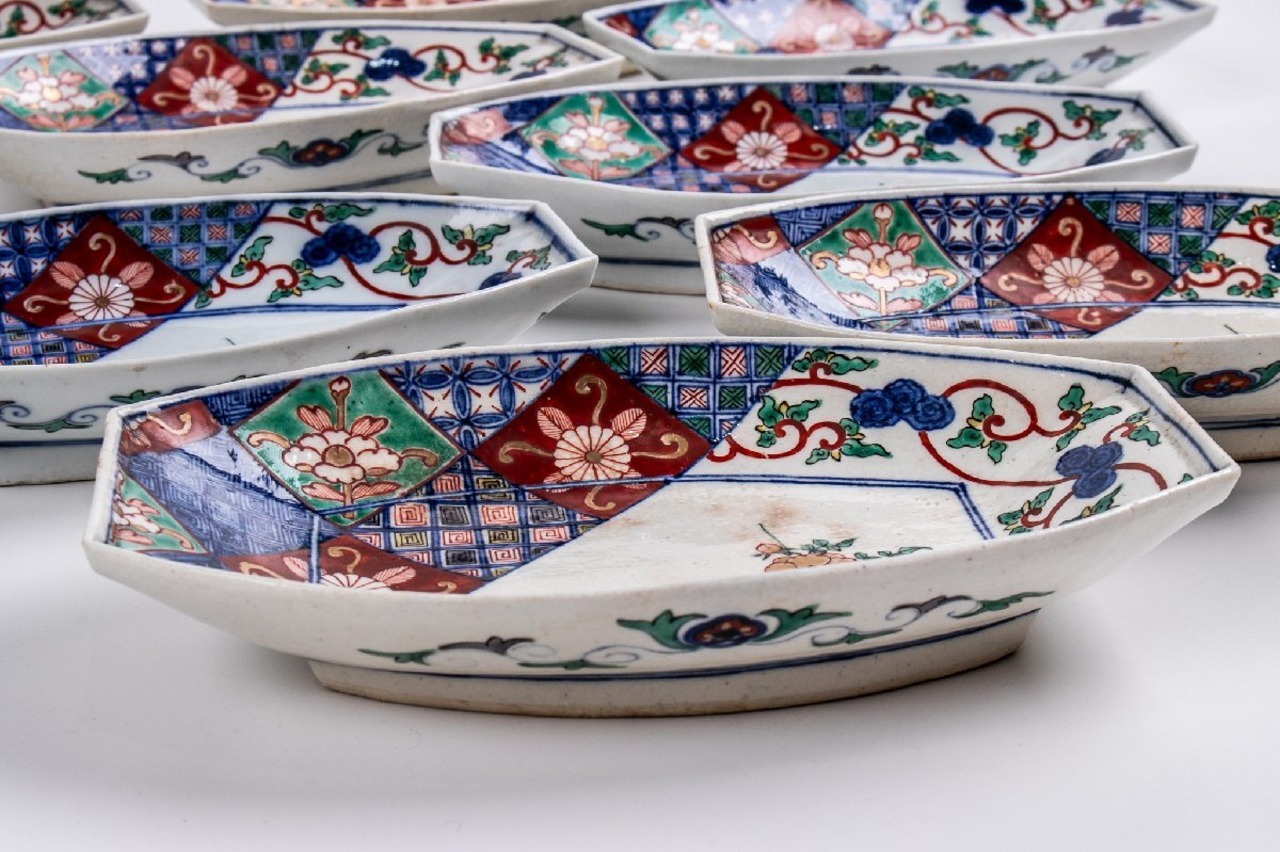 古伊万里 染錦更紗草花文舟形皿 8客 江戸後期 E1910A