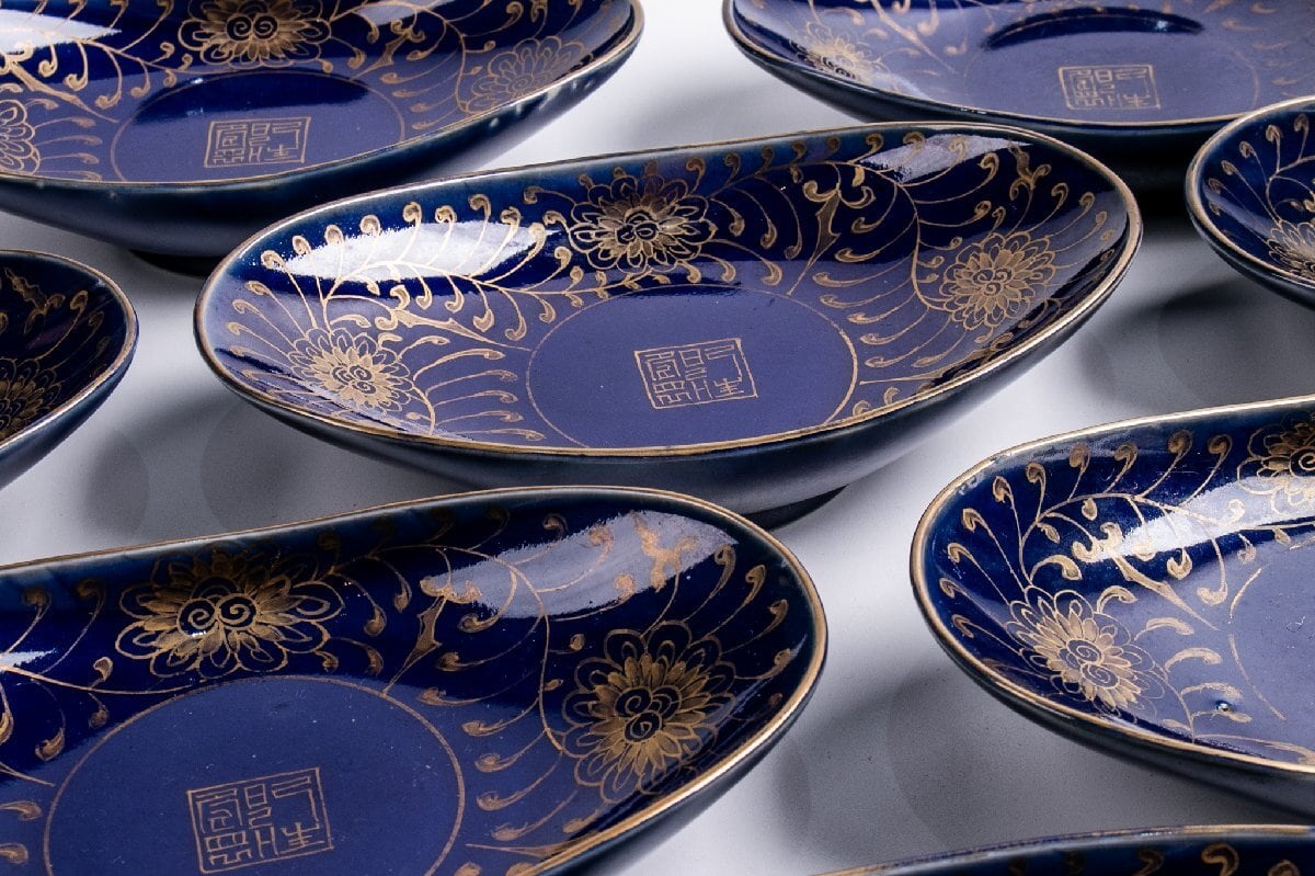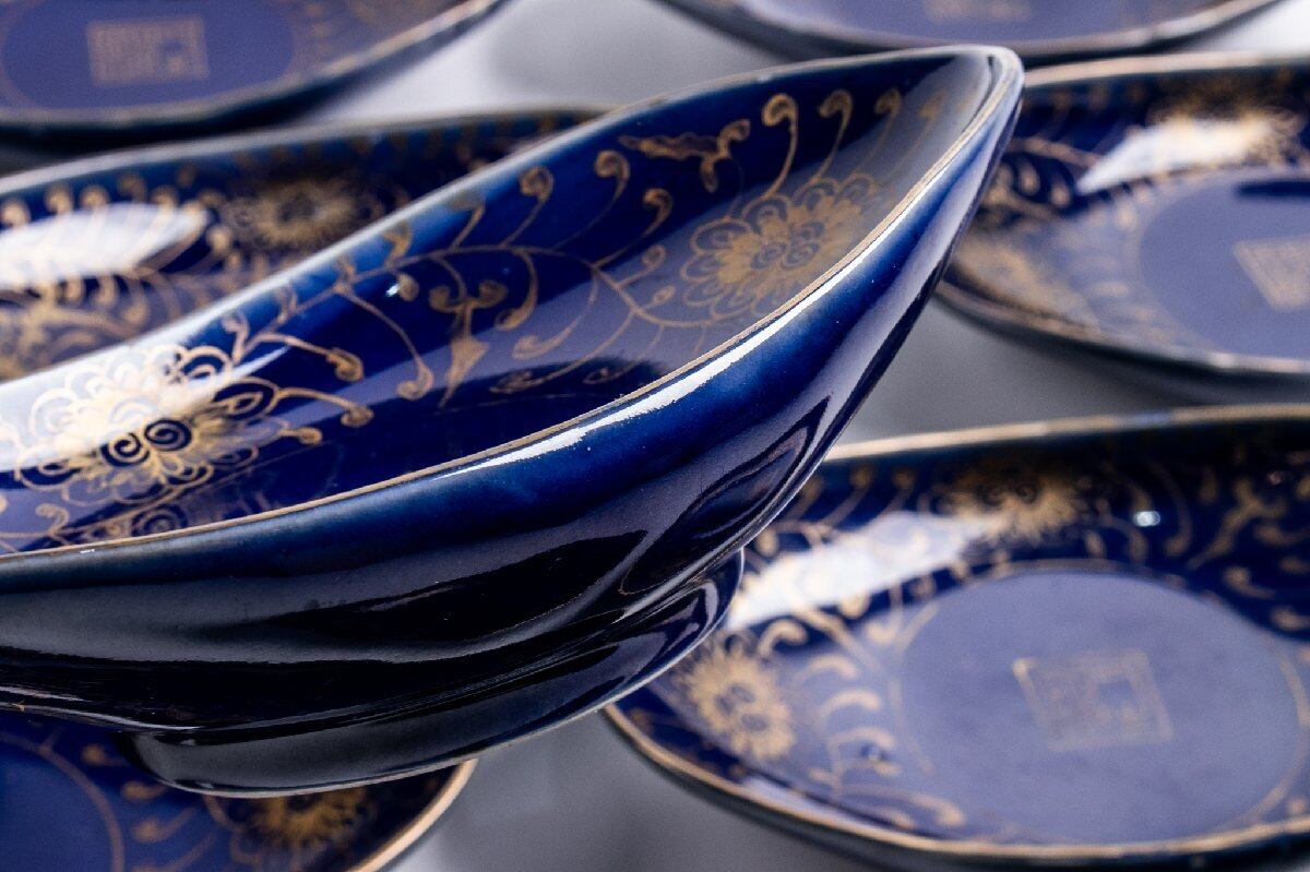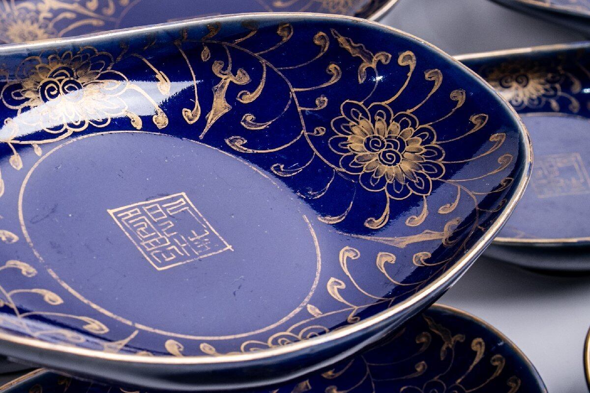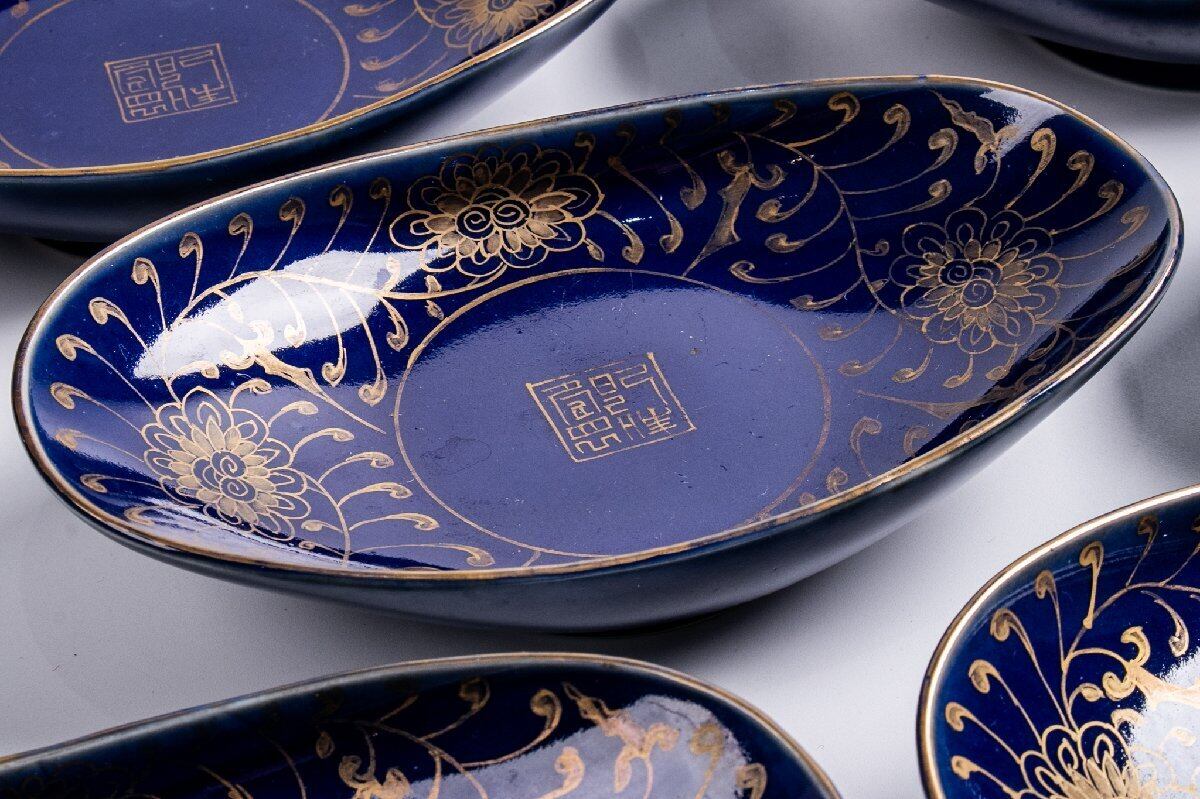 古伊万里 瑠璃釉金彩唐華文楕円皿 6客 明治時代 E1930C バラ売り可能です