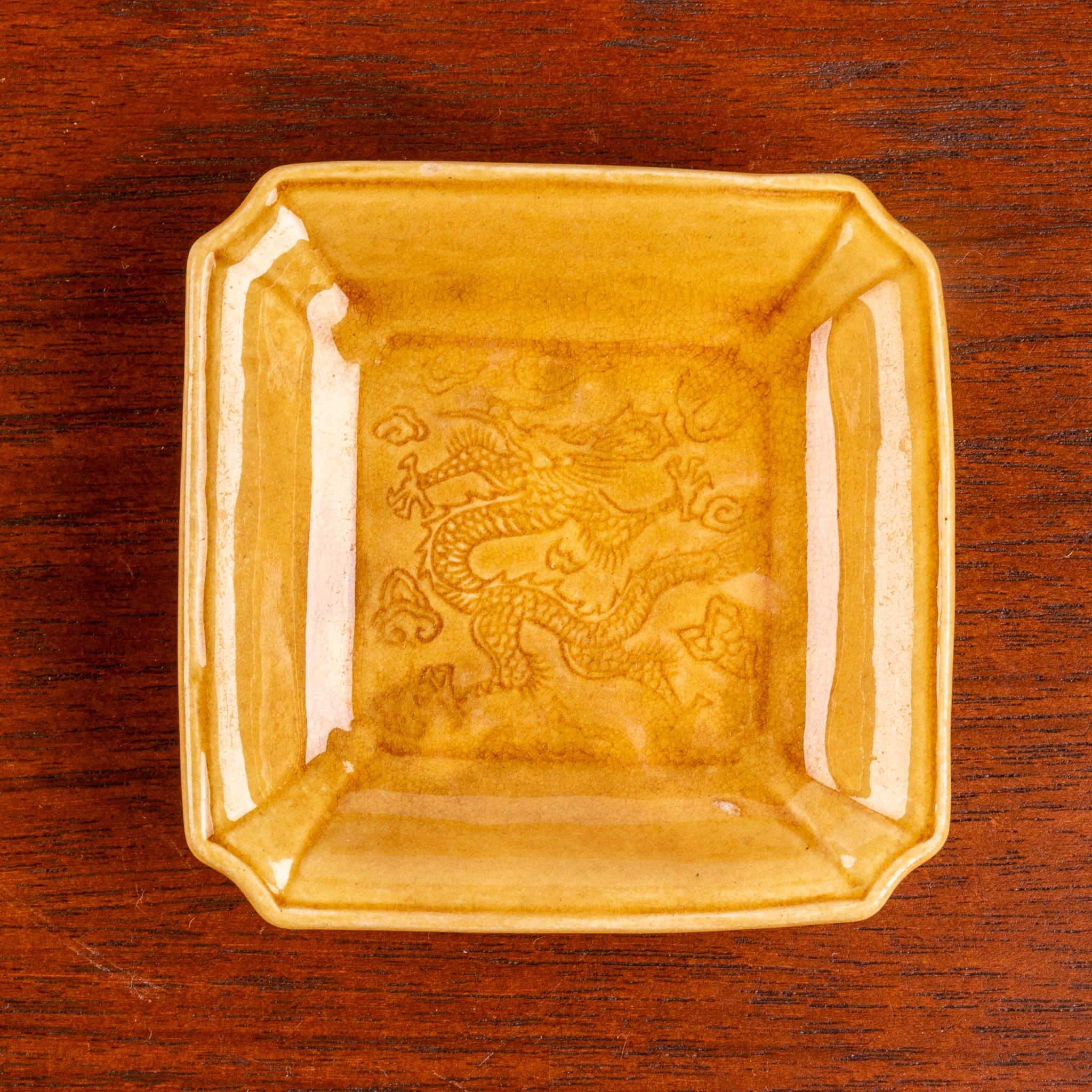 淡路民平焼 黄釉陰刻雲龍文 角皿 1客