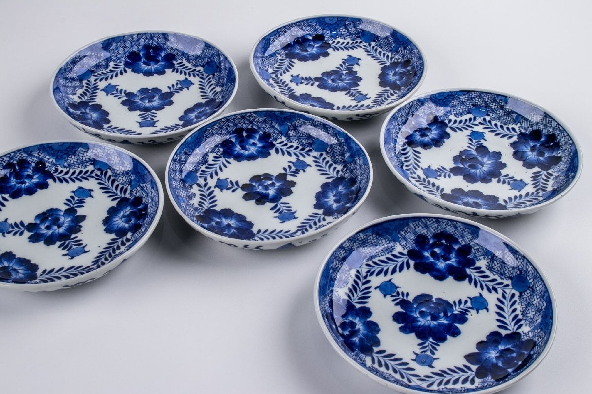 古伊万里 染付牡丹文五寸皿 6客 江戸後期 E2092D2 バラ売り可能です