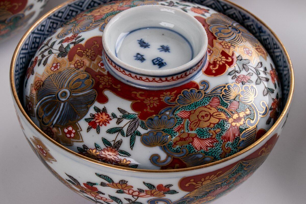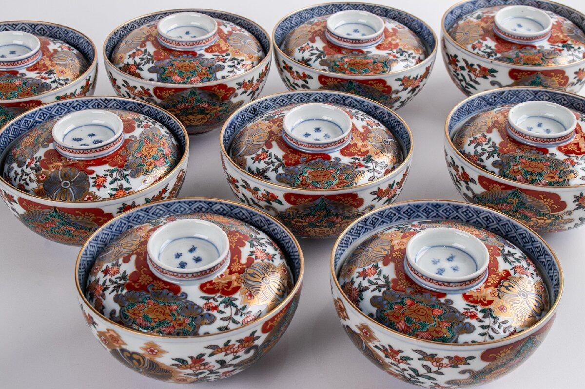 古伊万里 金襴手草花兎文蓋茶碗 9客 明治時代 E2234 バラ売り可能です