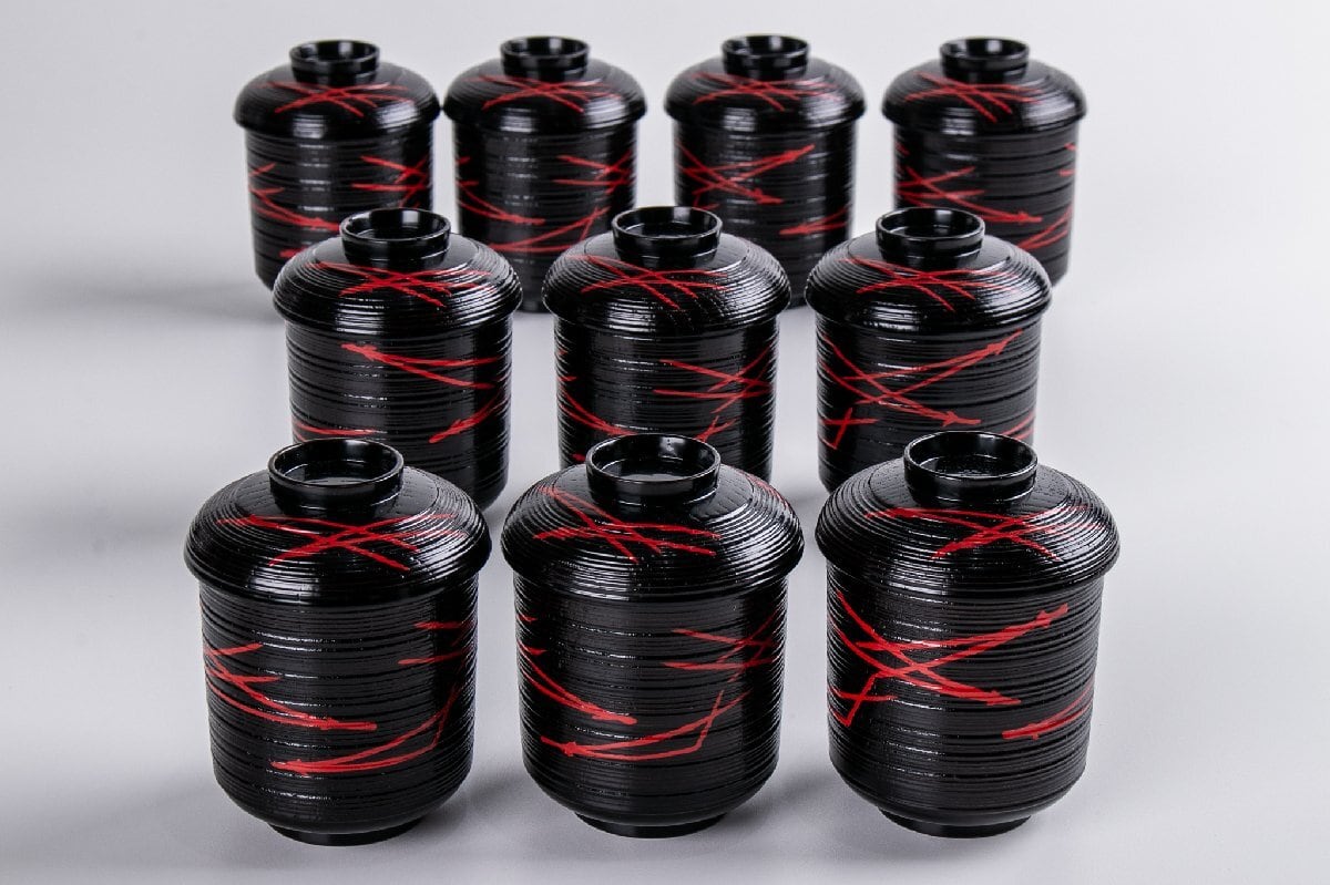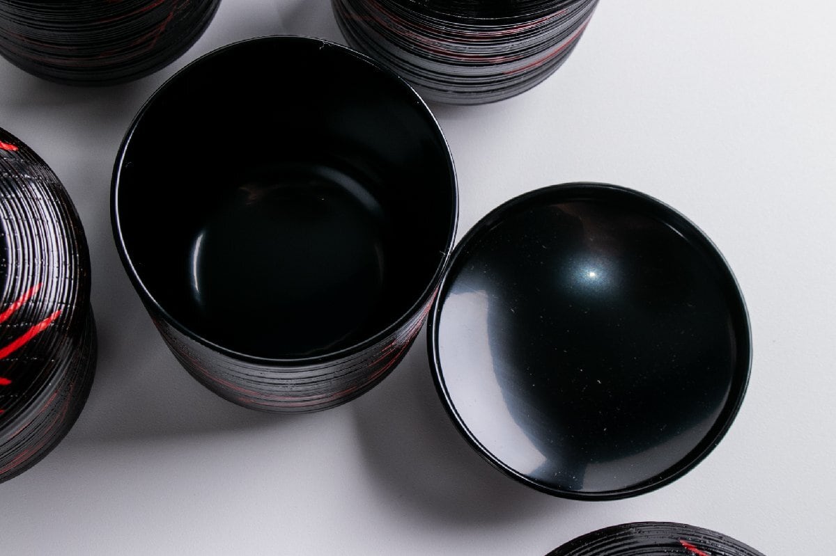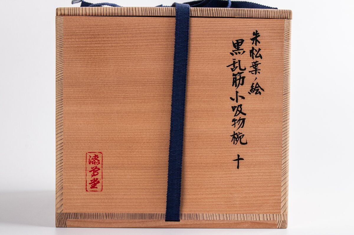 岡本漆専堂 朱松葉ノ絵 黒乱筋小吸物椀 10客 共箱 E2235