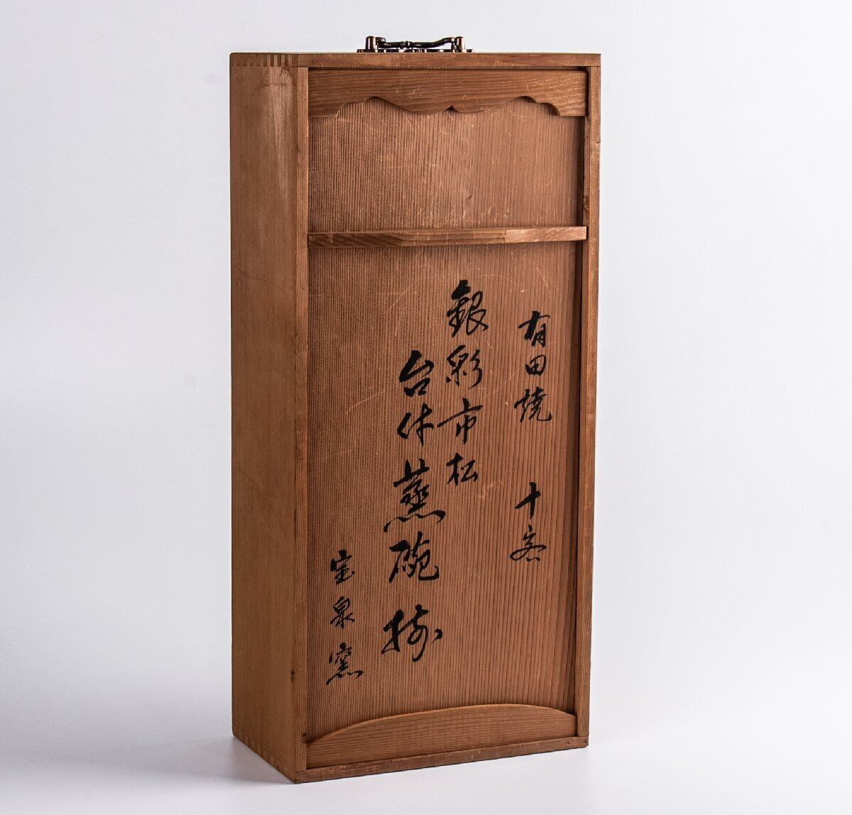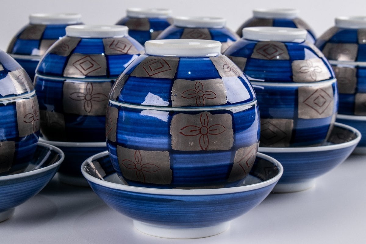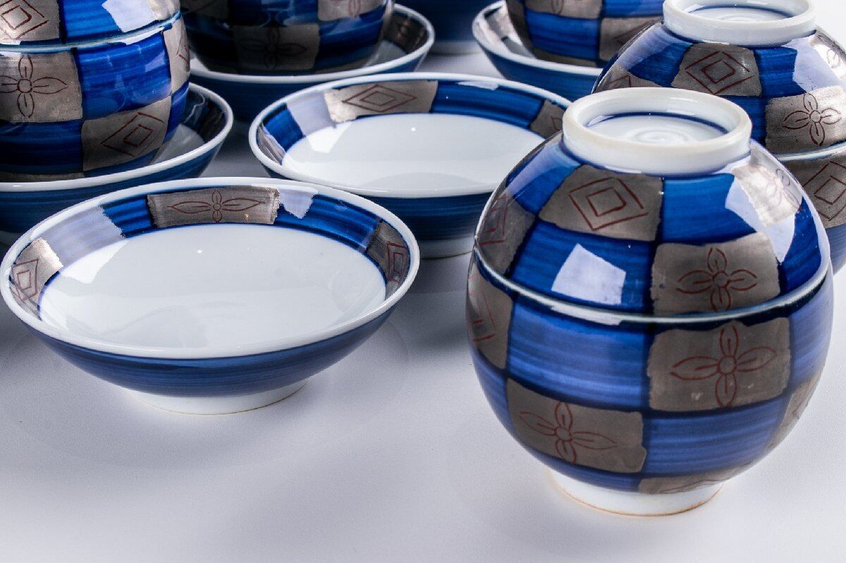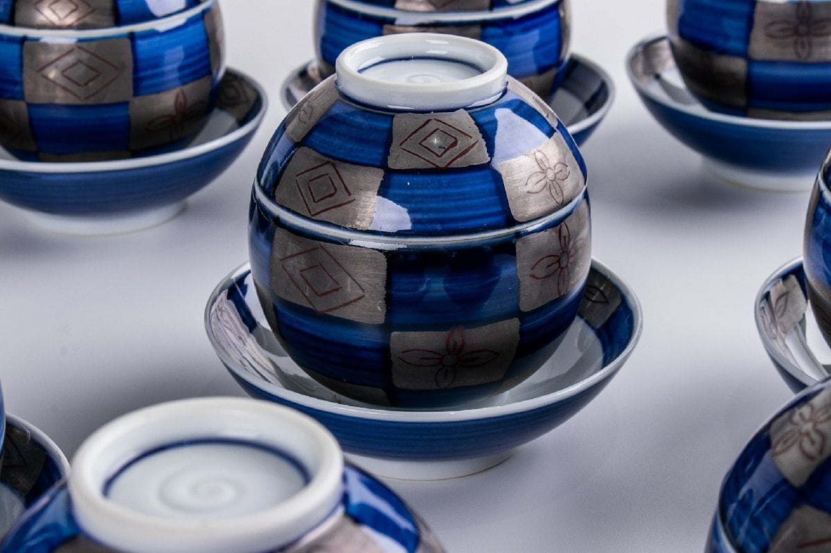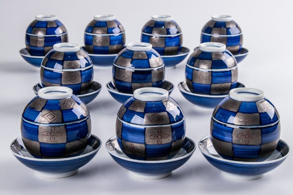 有田焼 宝泉窯 銀彩市松文 台付蒸碗 10客 箱付 E1938A