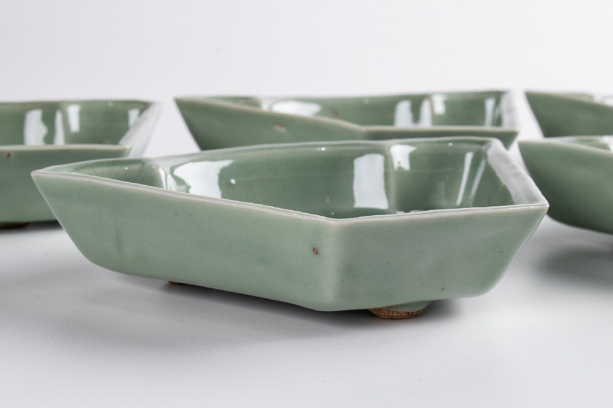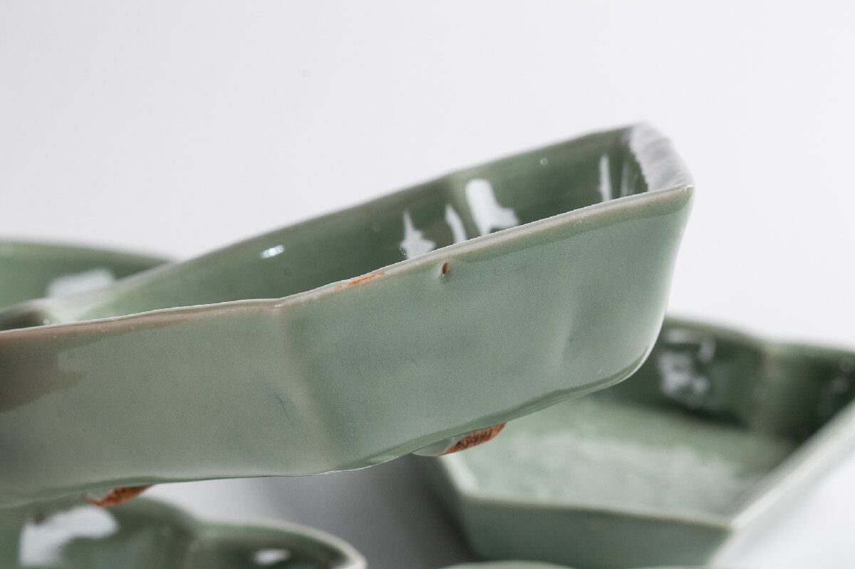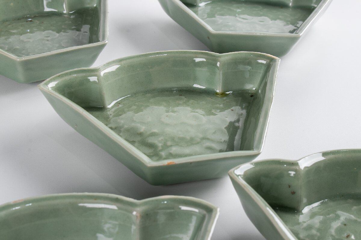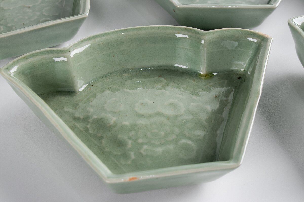 三田青磁 陽刻牡丹文変り形皿 5客 E1918 バラ売り可能です