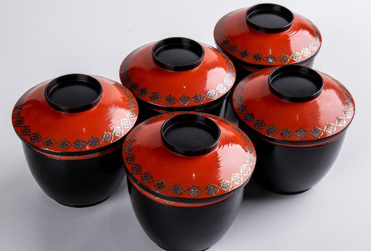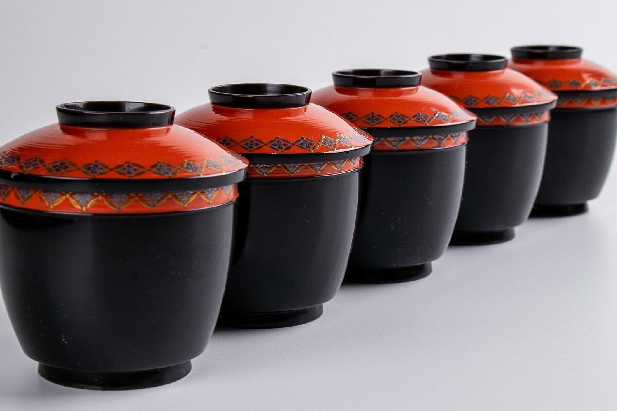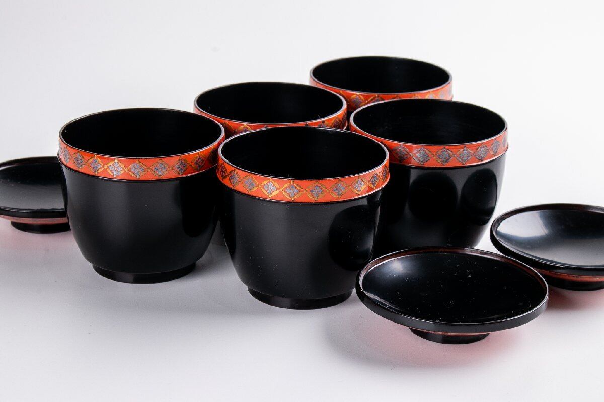 時代物 七宝繋ぎ蒔絵 小吸物椀 5客 箱付 F092