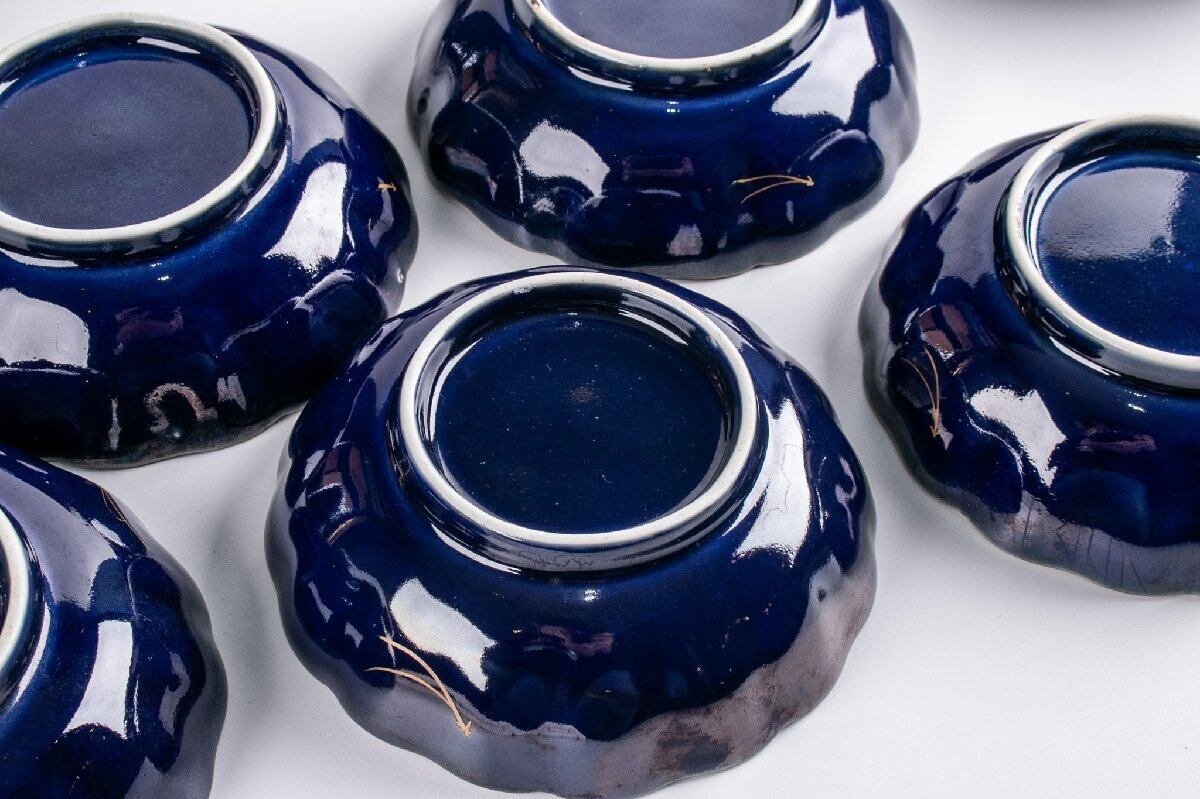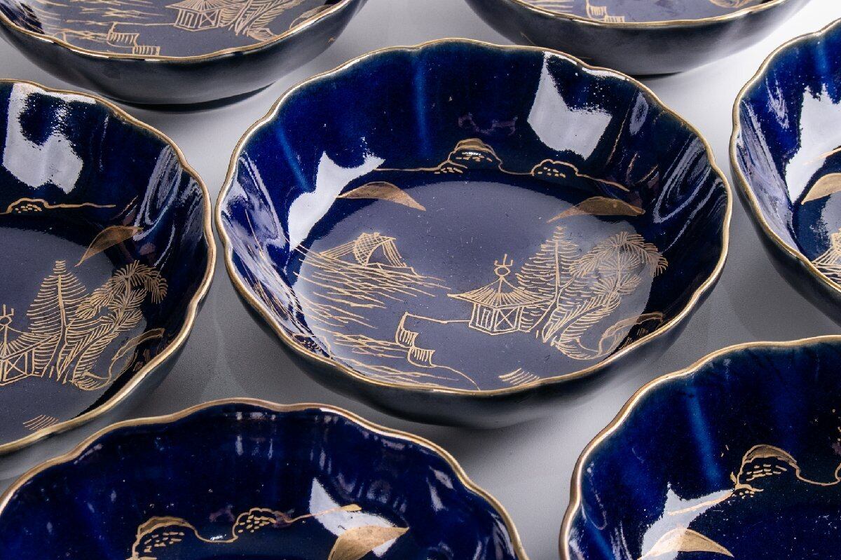 古伊万里 瑠璃釉金彩山水文なます皿 10客 明治時代 F175D バラ売り可能です