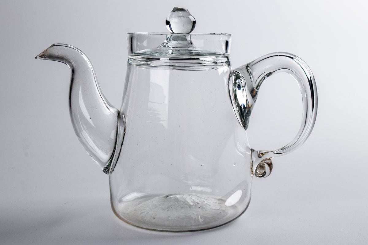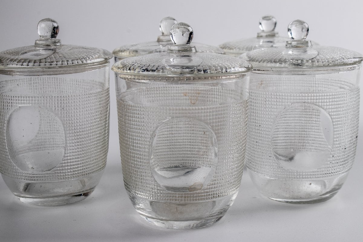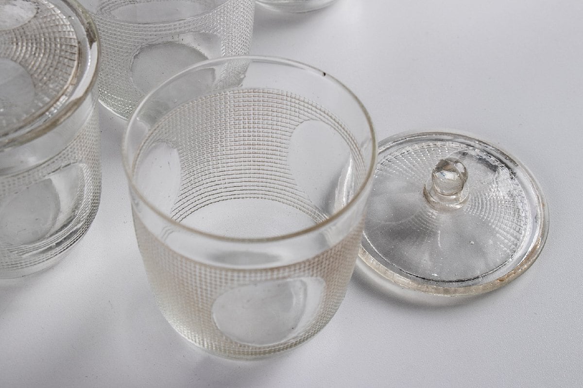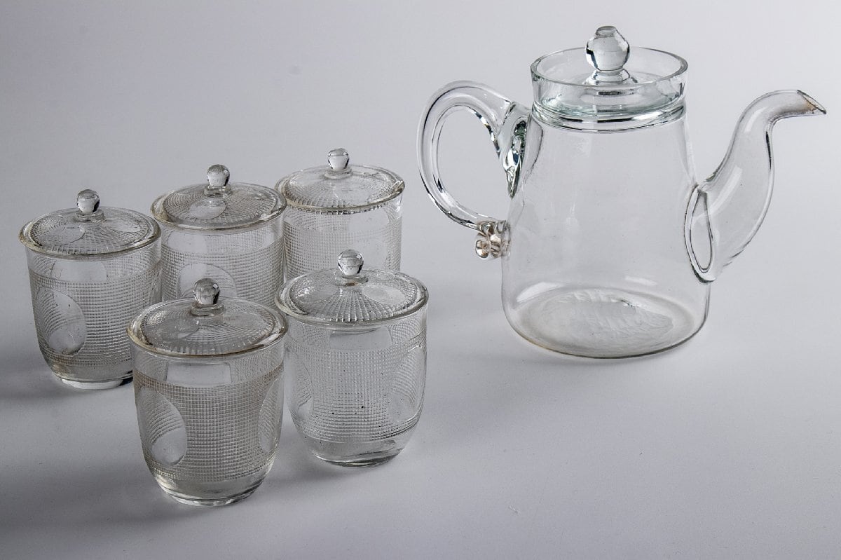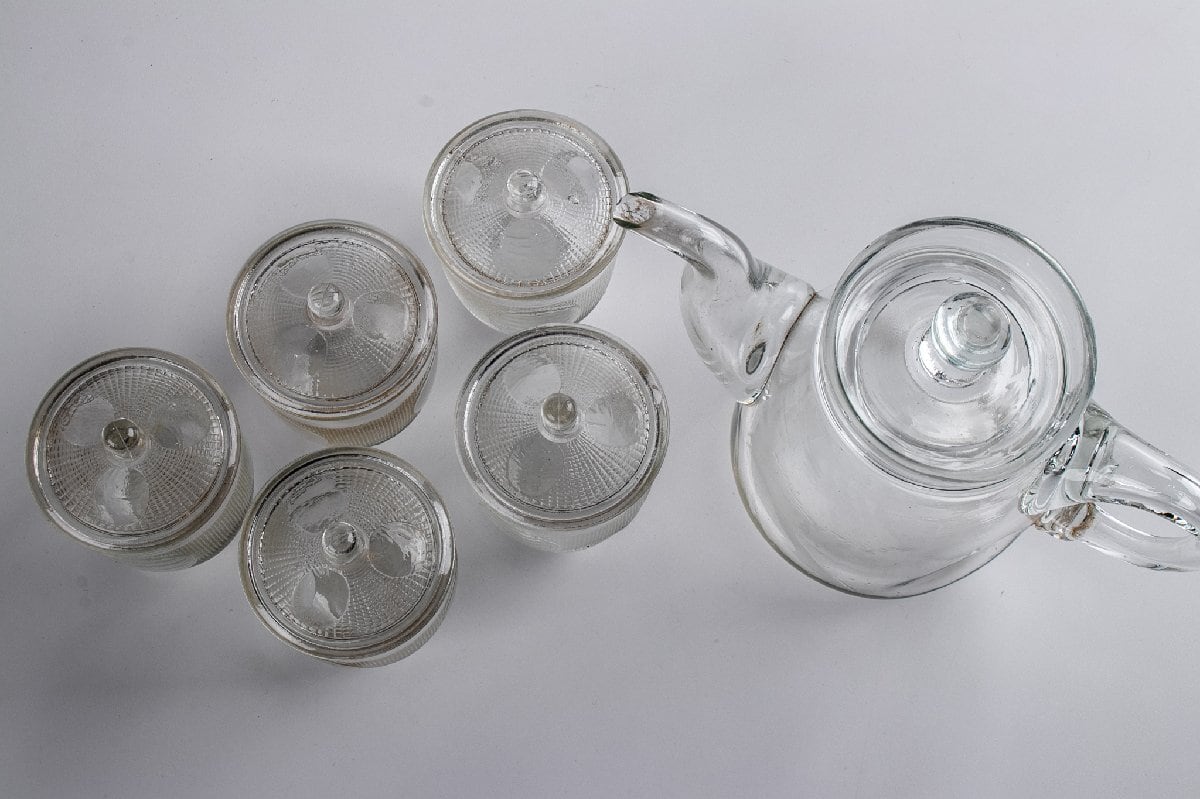 和物 プレスガラス 丸文ティーセット ウランガラス 箱付 明治時代 F167