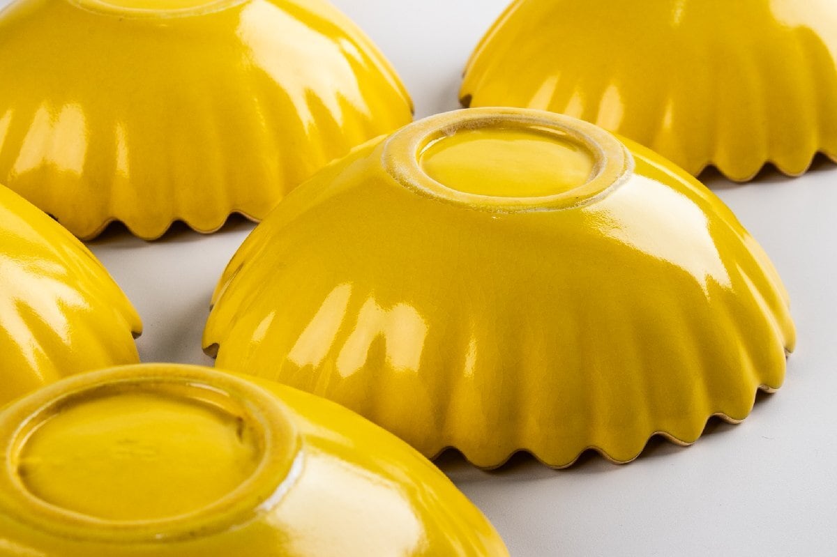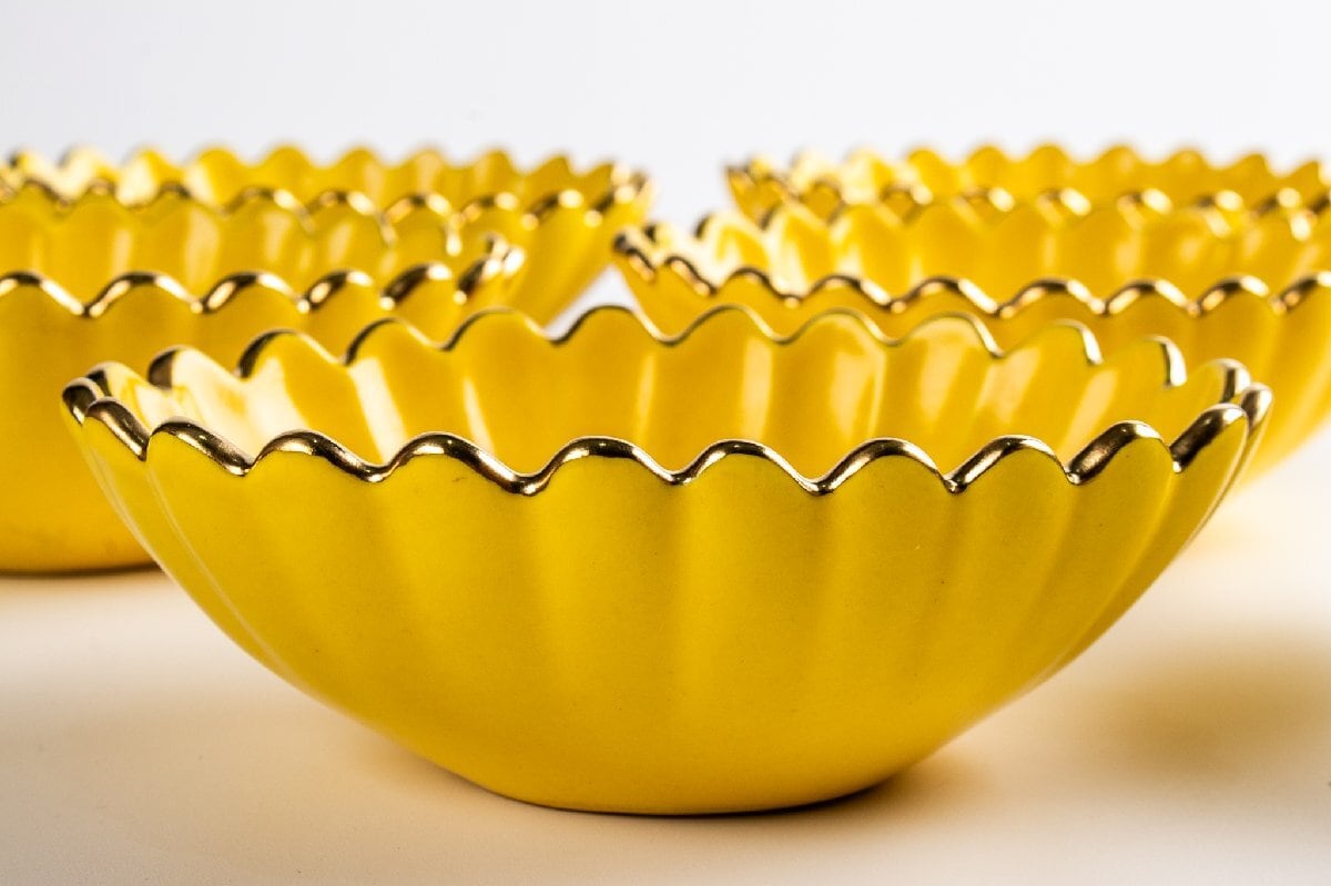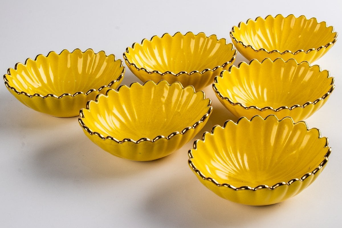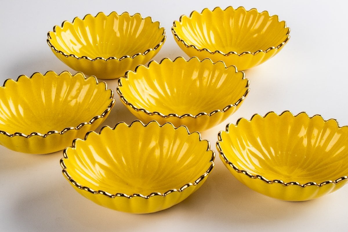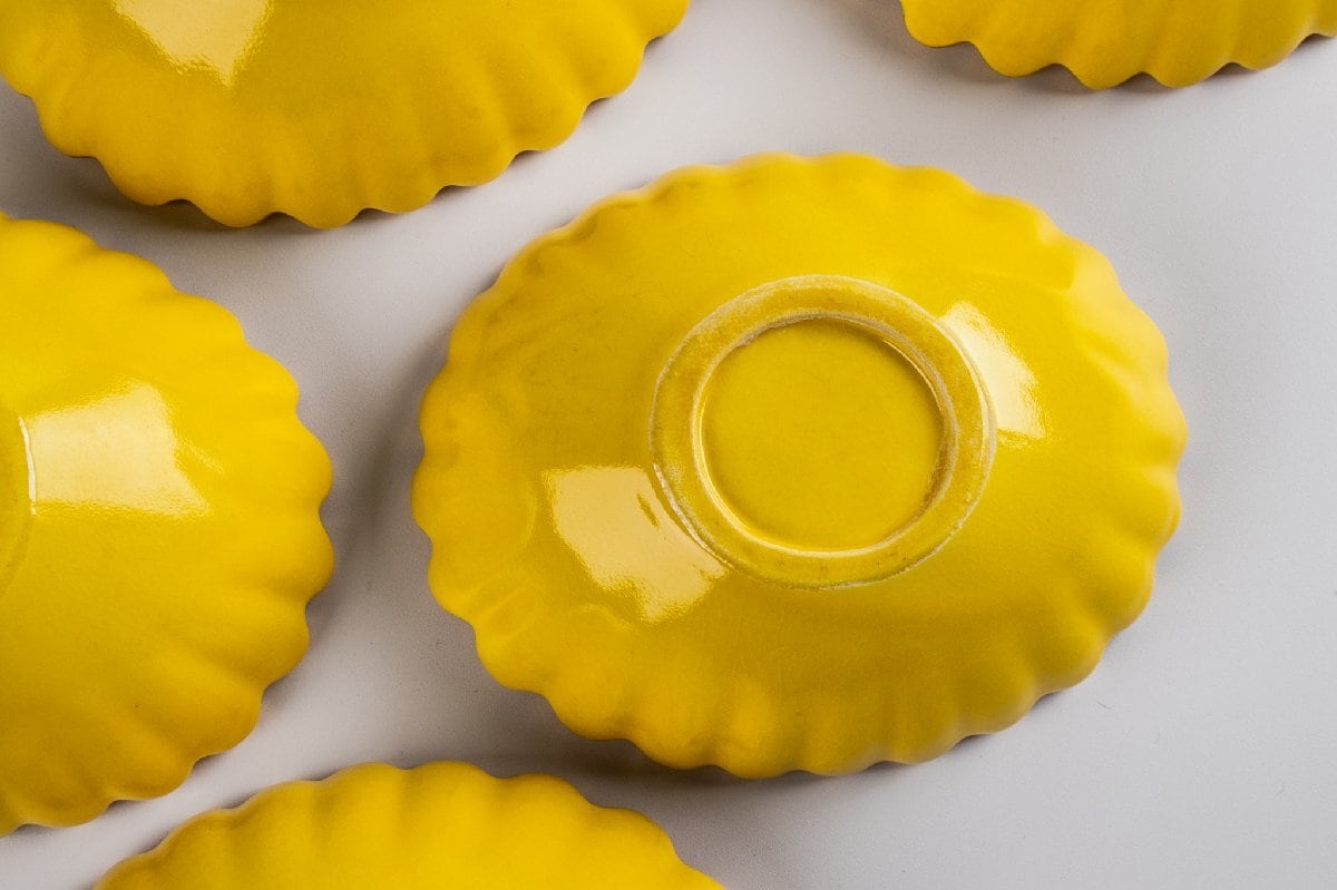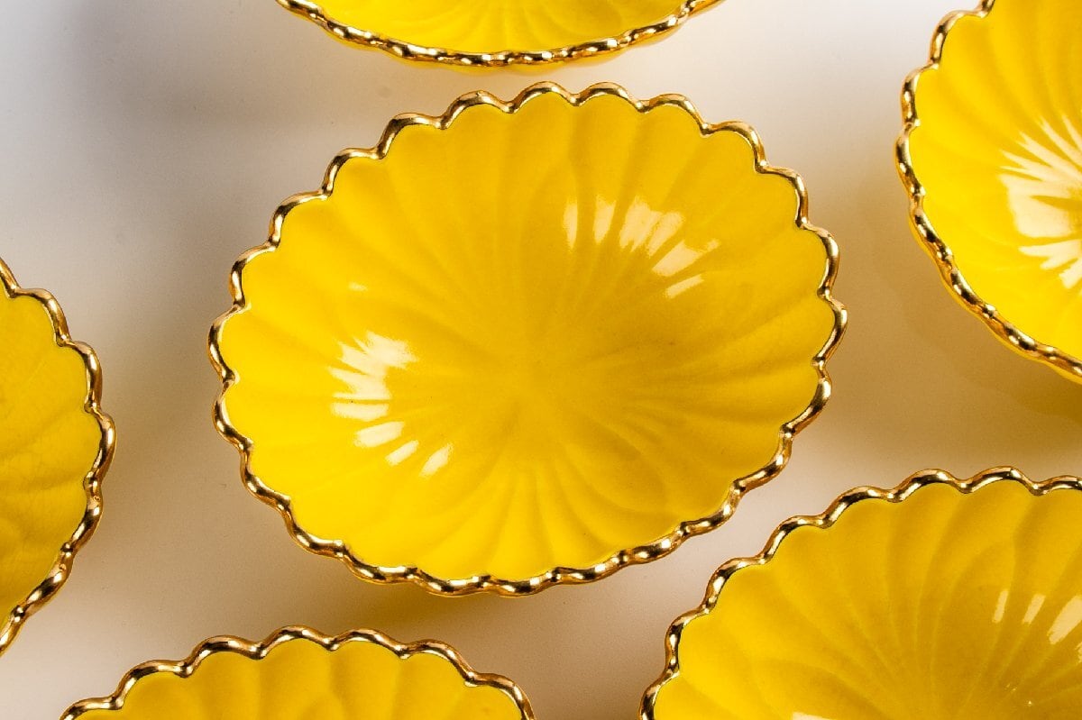 加賀瑞山 黄釉 菊花向付 6客 共箱 F224