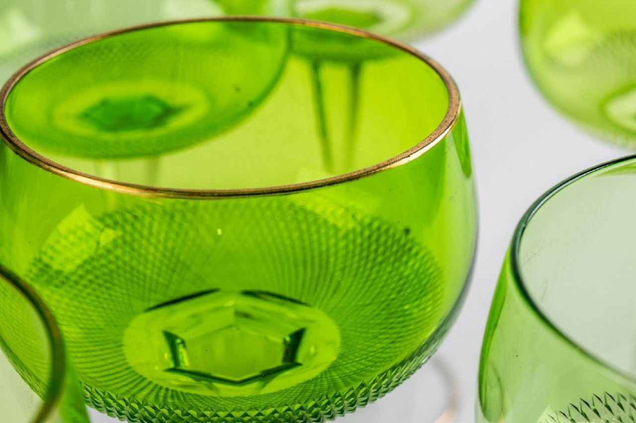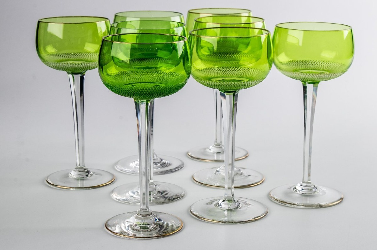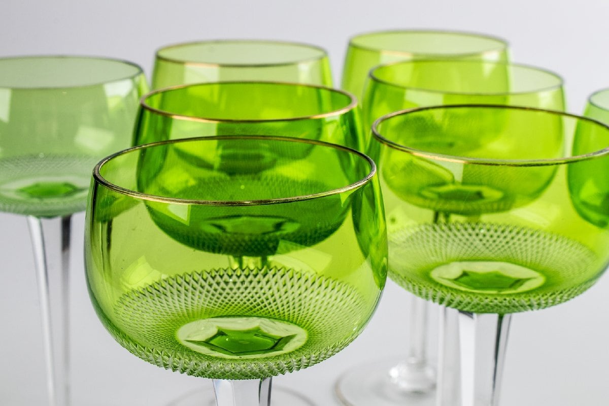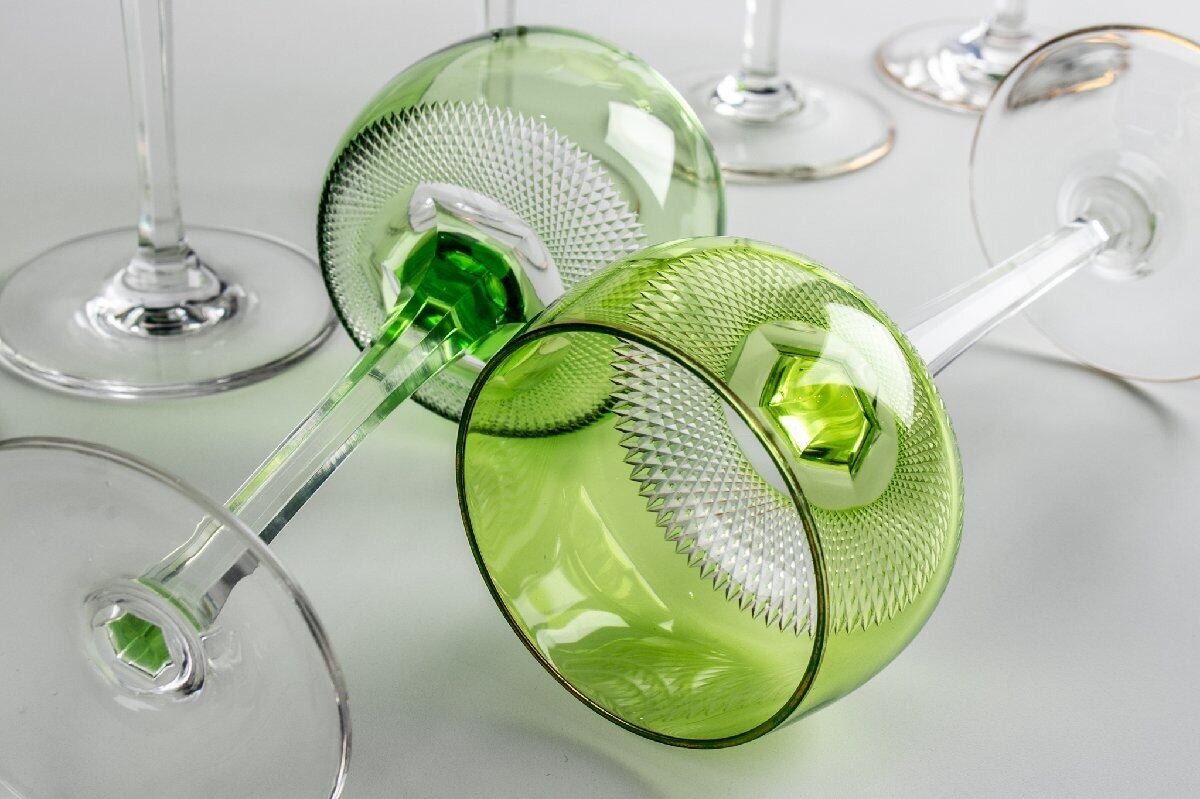 ウランガラス ギヤマン切子 緑被せワイングラス 8客 F297