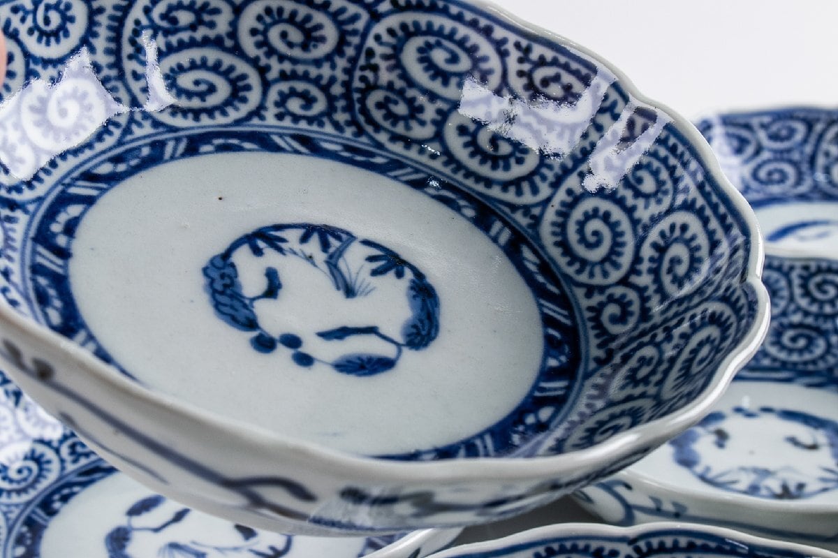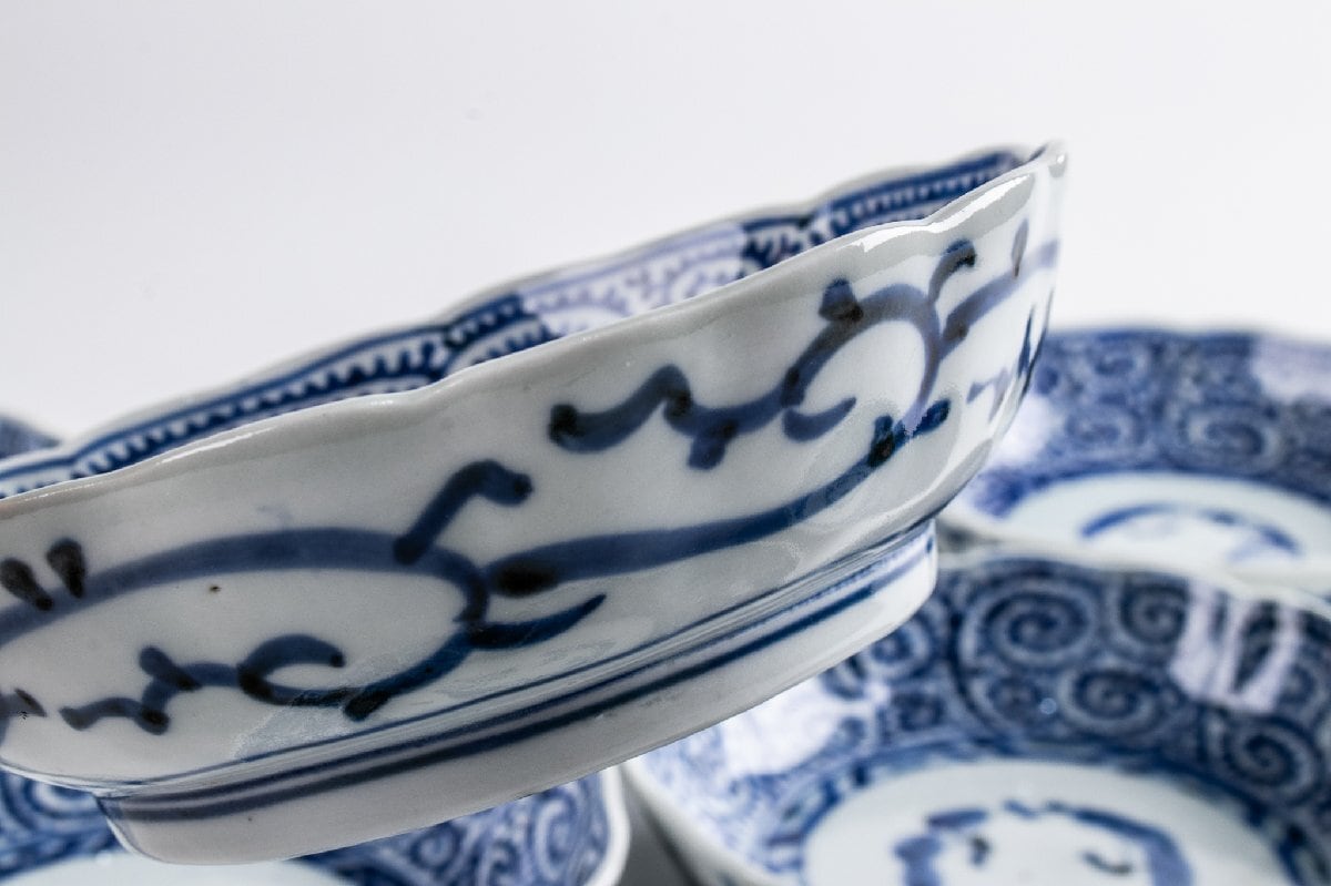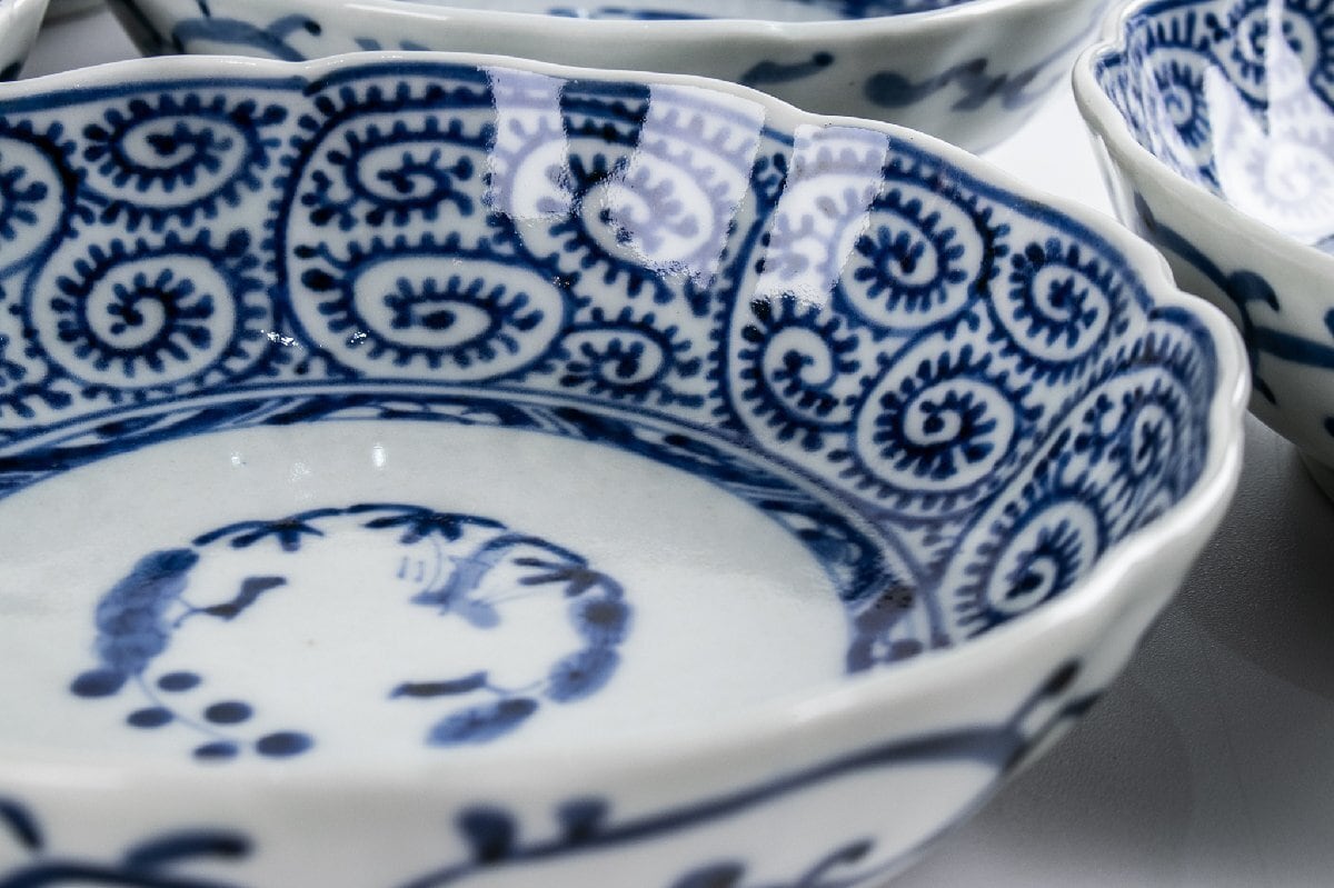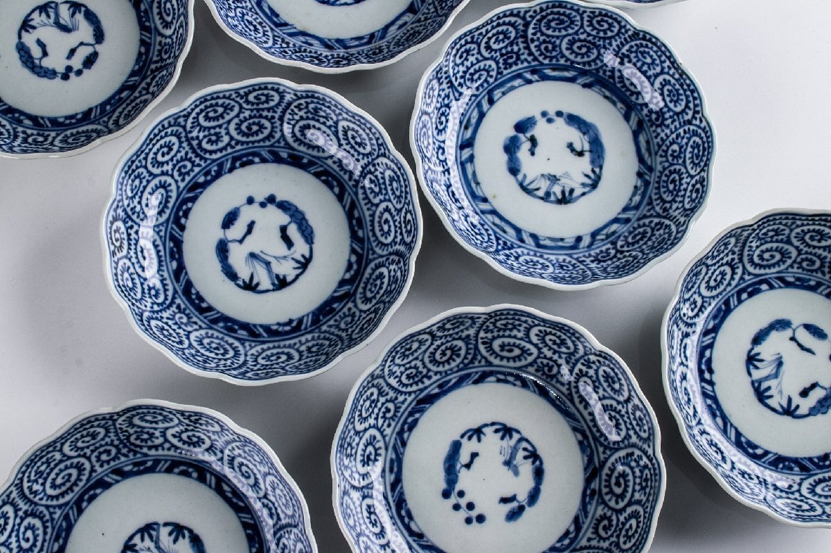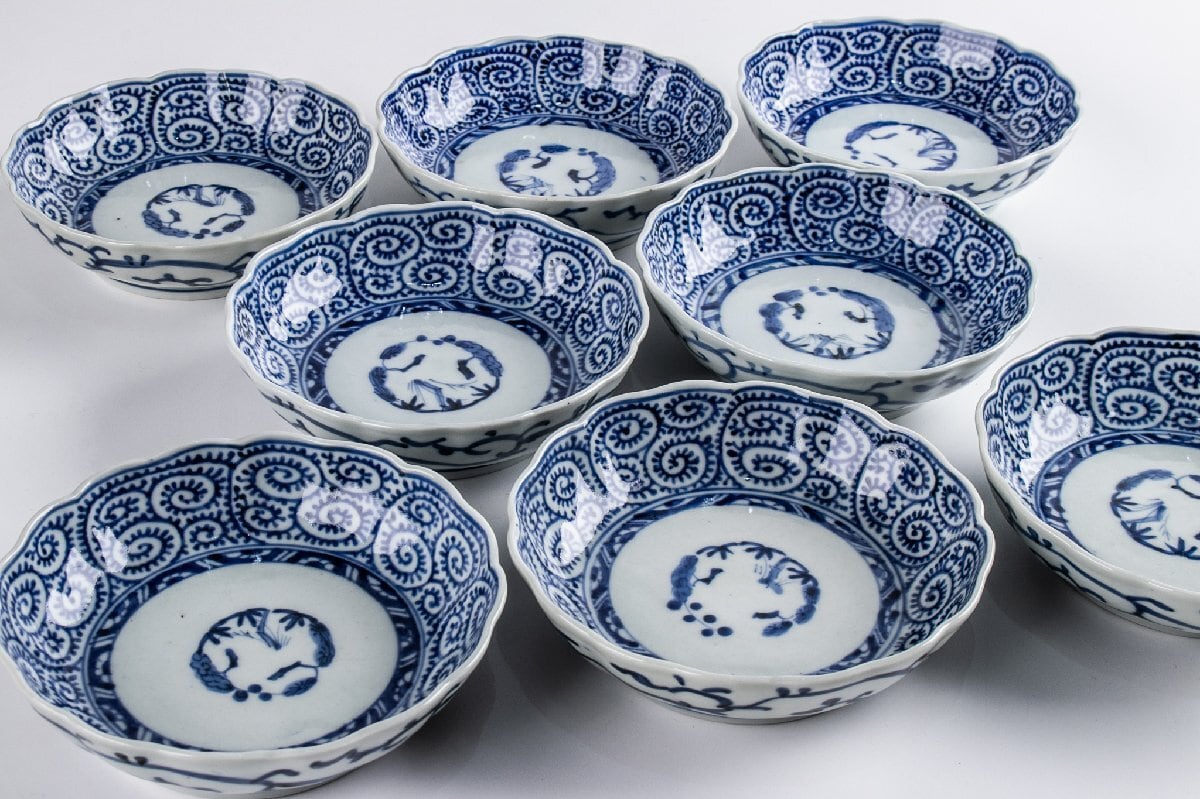 古伊万里 染付蛸唐草三友文なます皿 8客 江戸後期 F337 バラ売り可能です