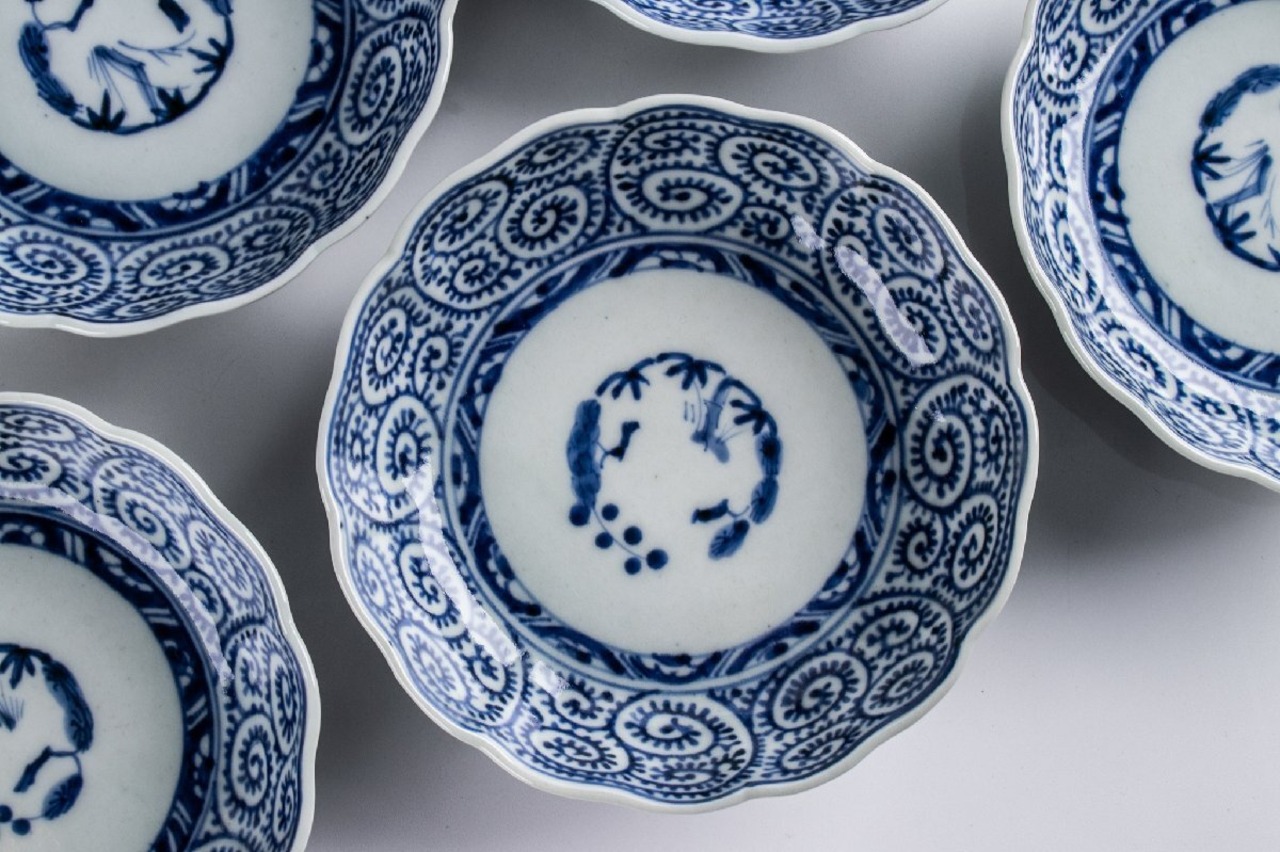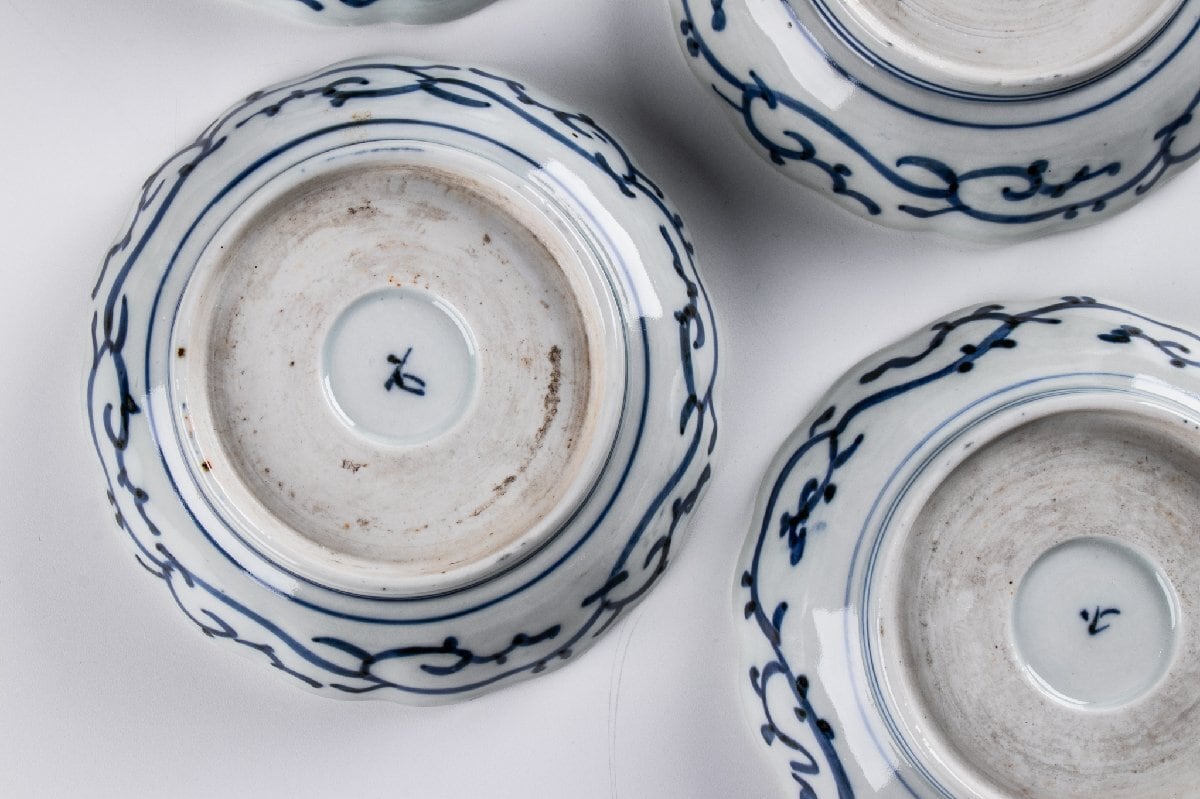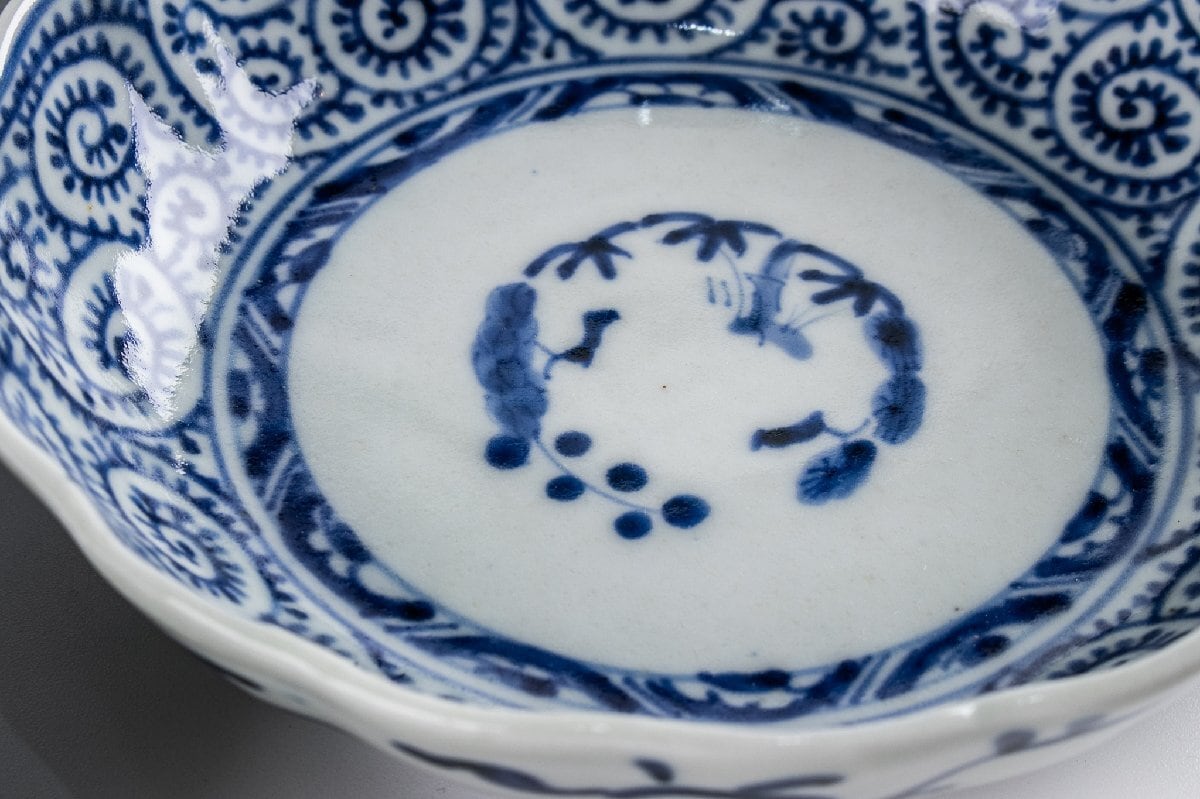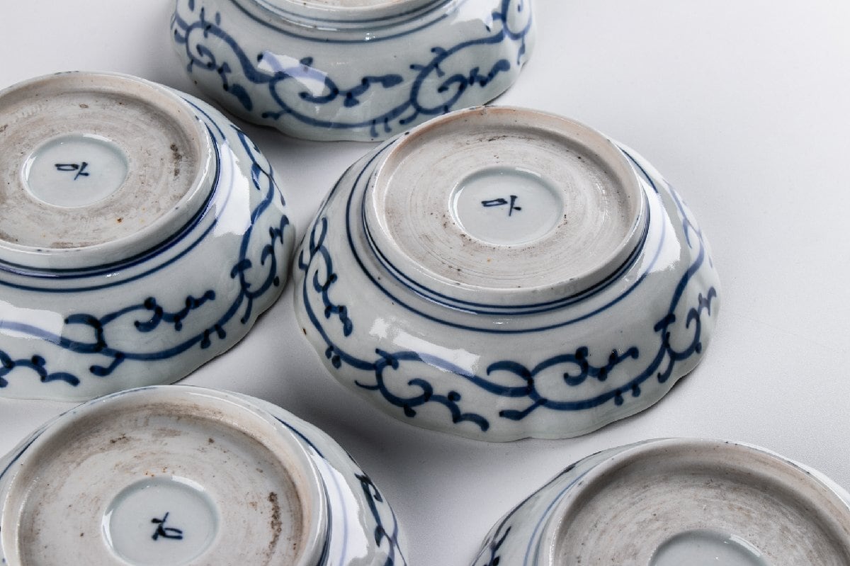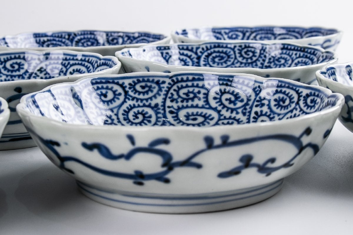 古伊万里 染付蛸唐草三友文なます皿 8客 江戸後期 F337 バラ売り可能です