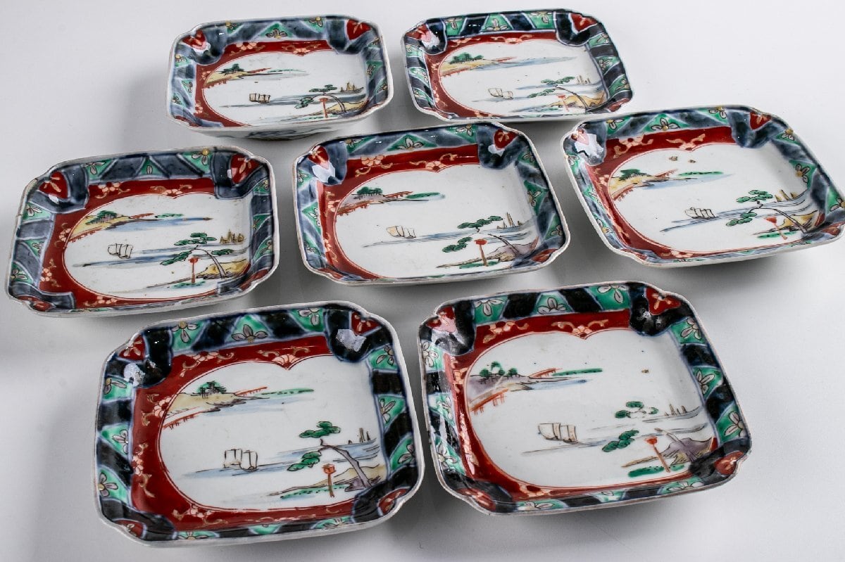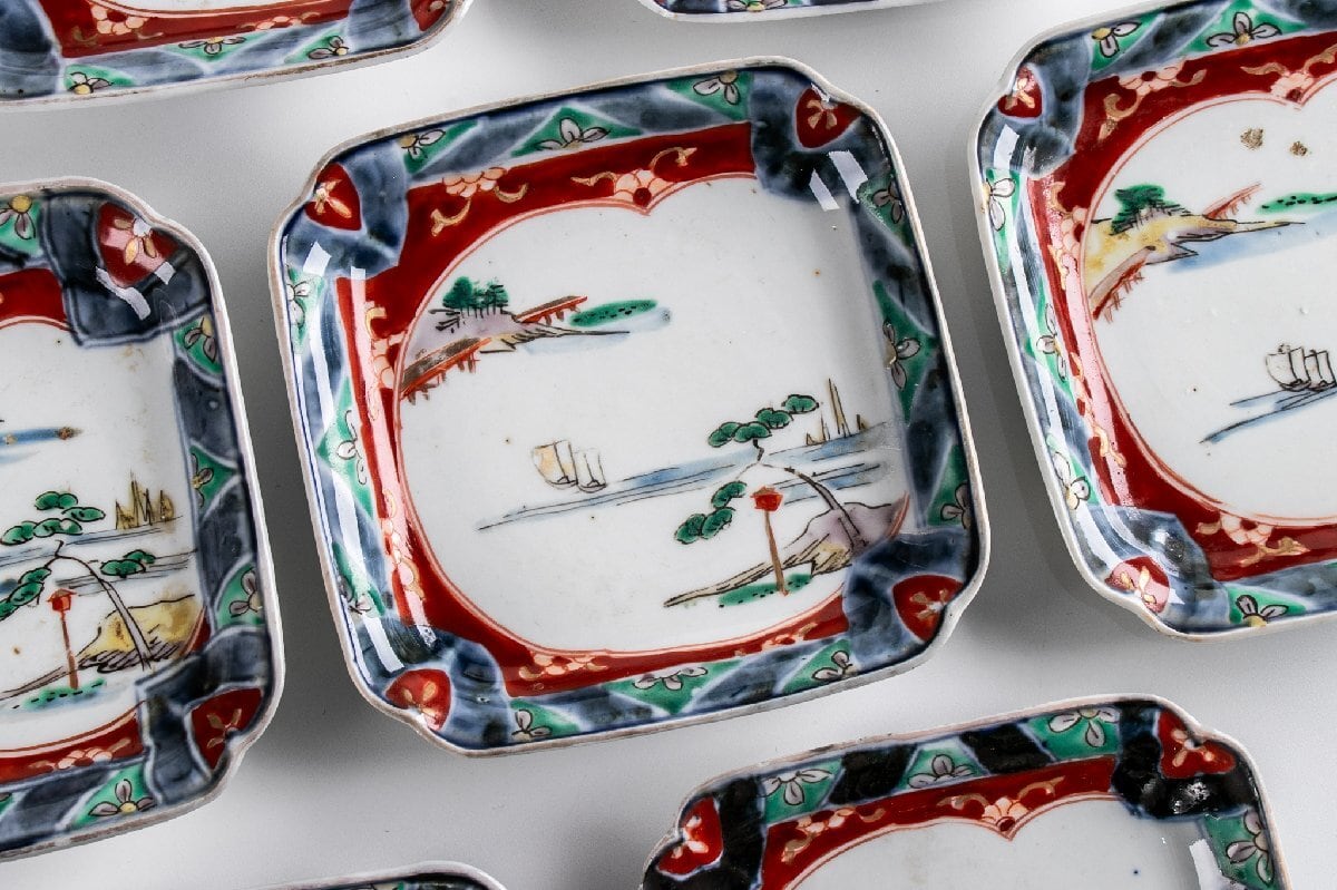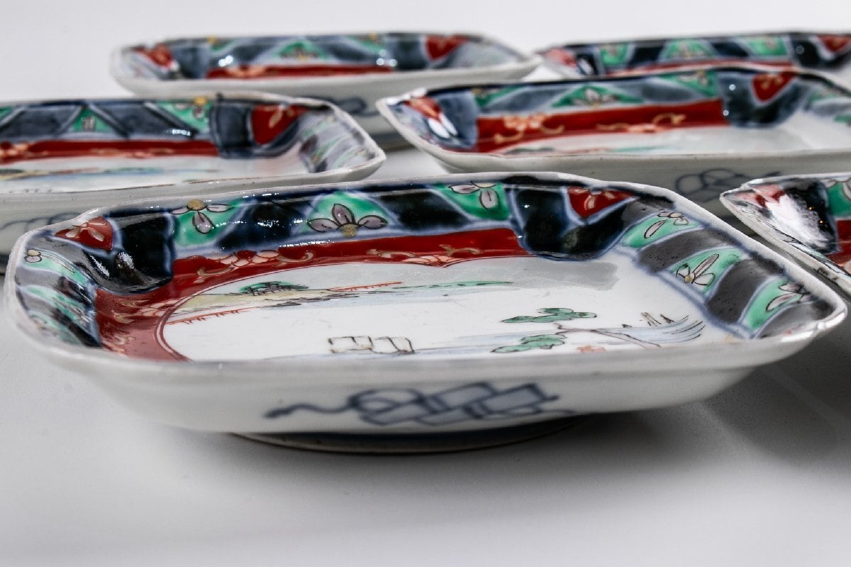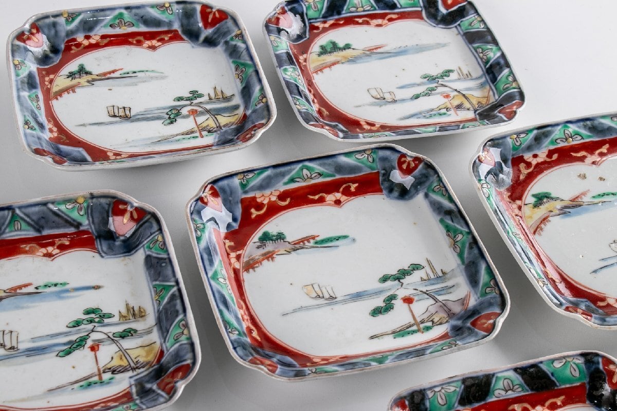 古伊万里 染錦山水帆船文四方皿 7客 明治時代 F277 バラ売り可能です