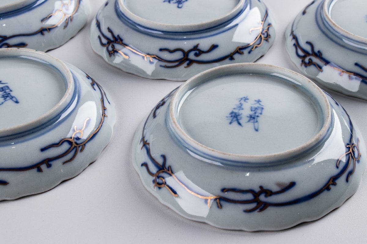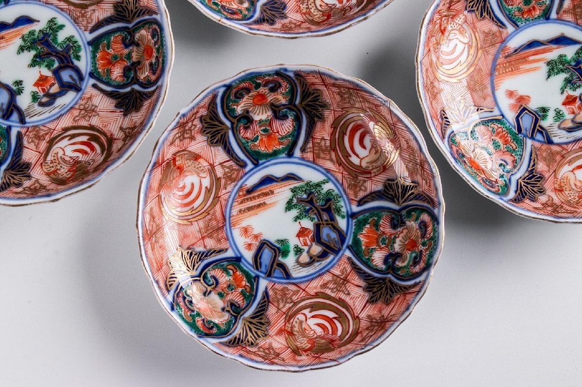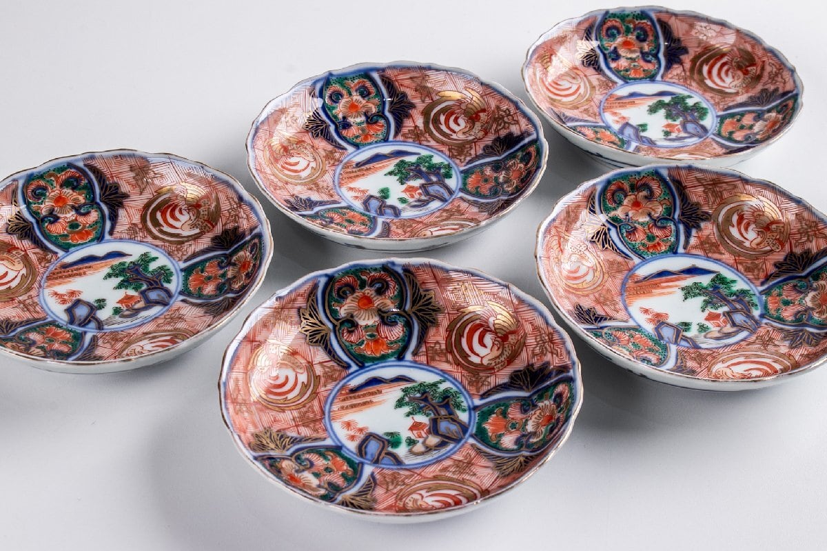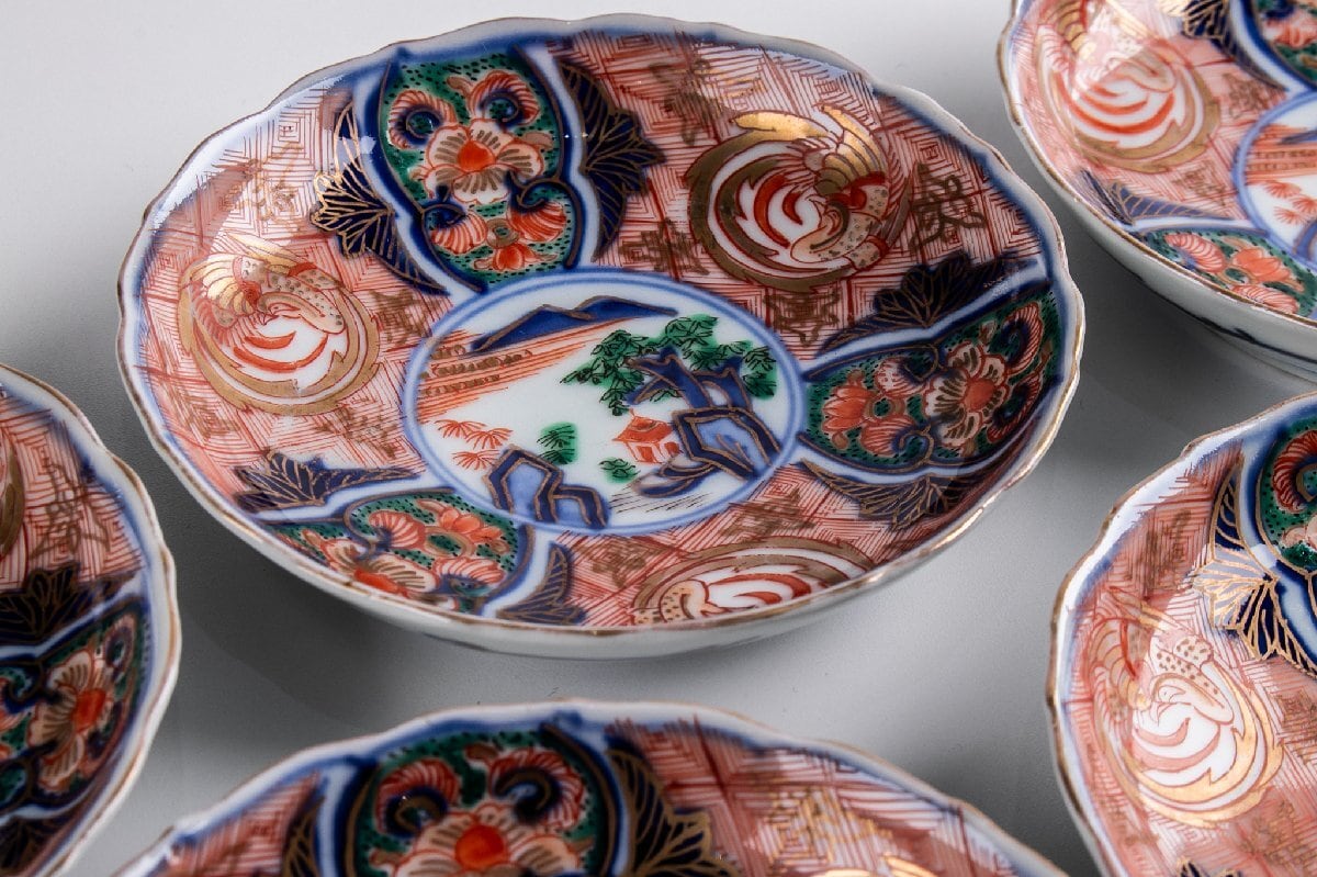 古伊万里 金襴手山水鳳凰文四寸皿 5客 明治時代 F288D バラ売り可能です