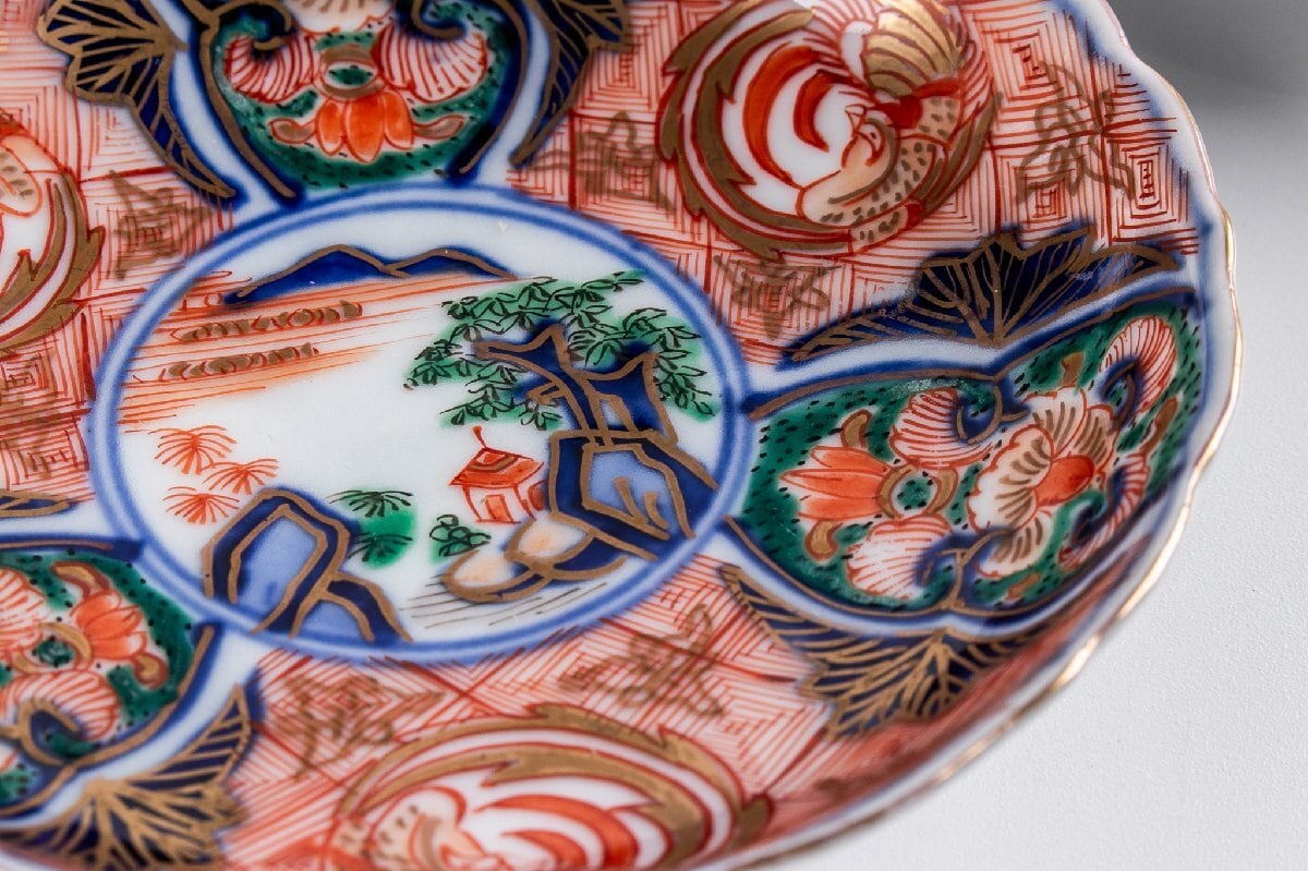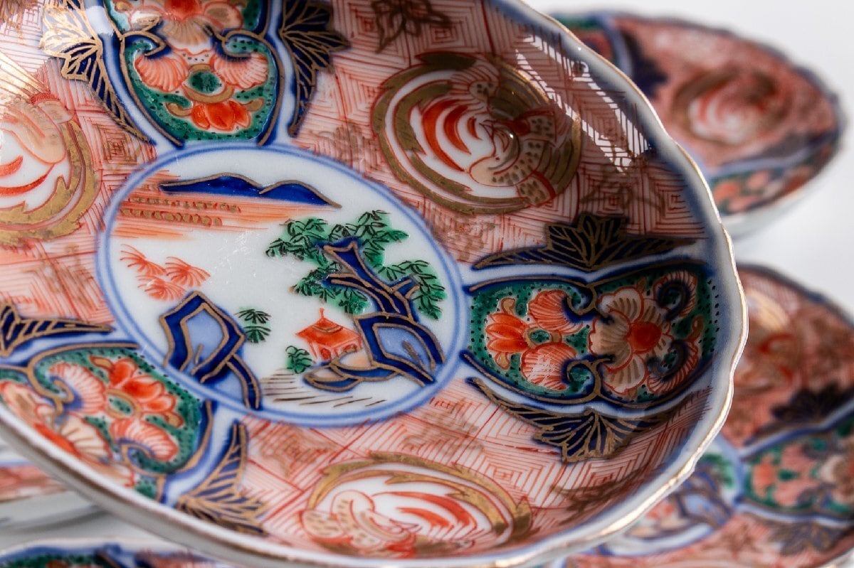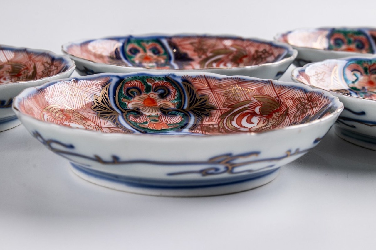 古伊万里 金襴手山水鳳凰文四寸皿 5客 明治時代 F288D バラ売り可能です
