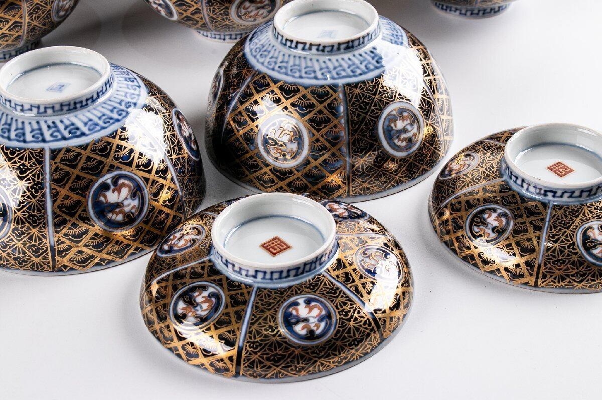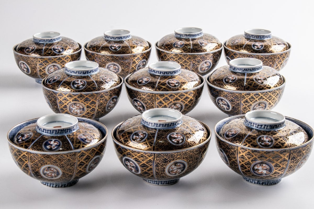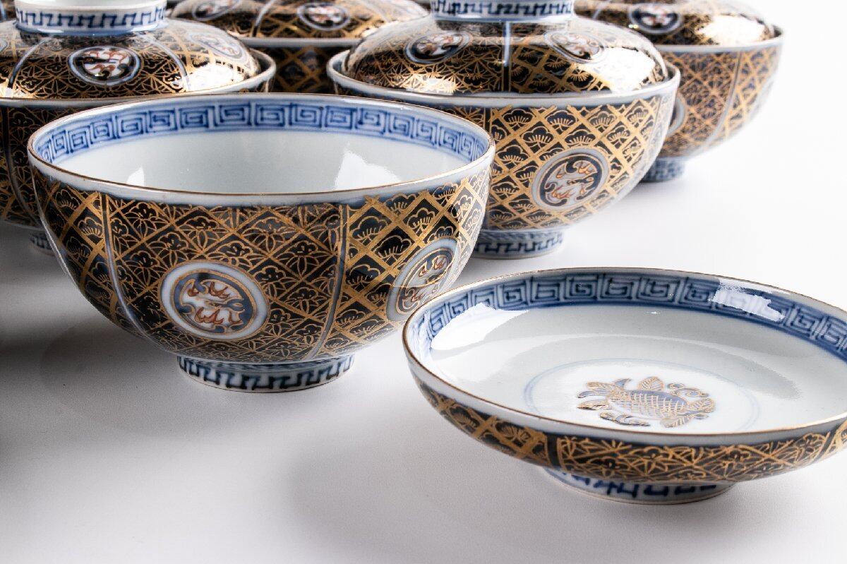 古伊万里 金襴手更紗文蓋茶碗 蓋物 10客 明治時代 F396B バラ売り可能です