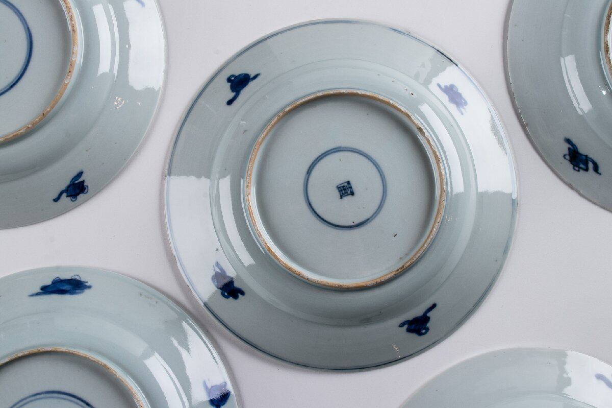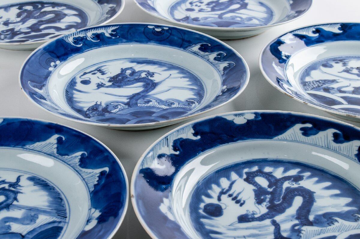 南京染付 荒磯鯉龍文七寸皿 9客 清時代 F384B