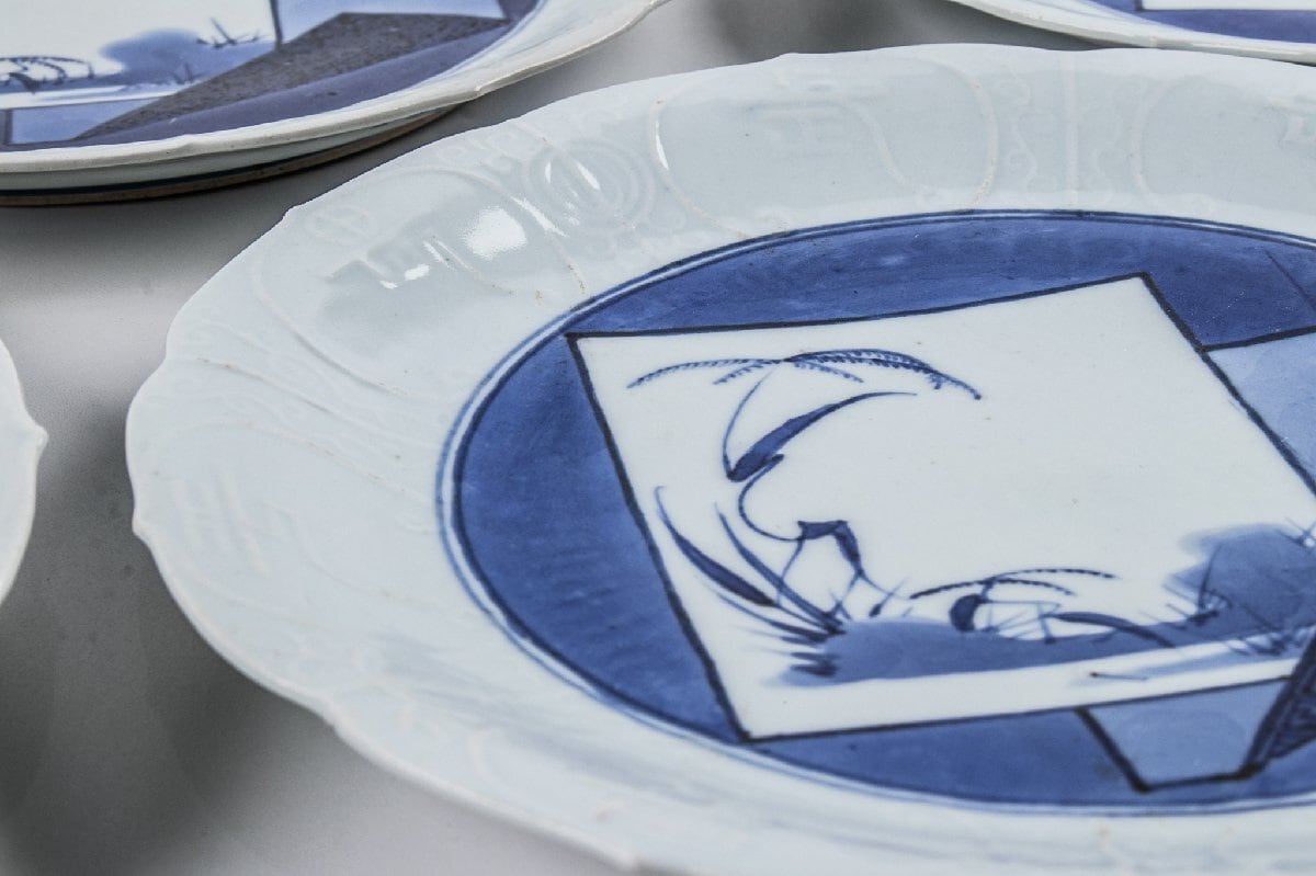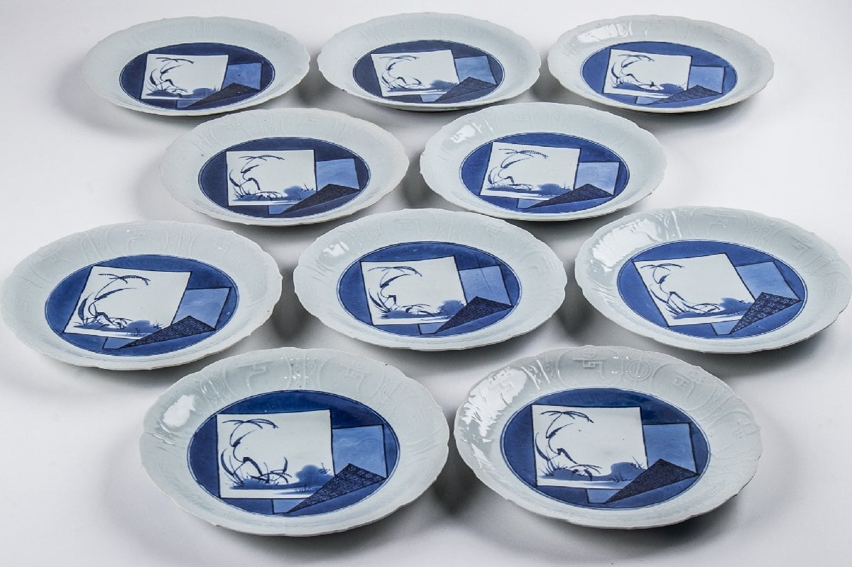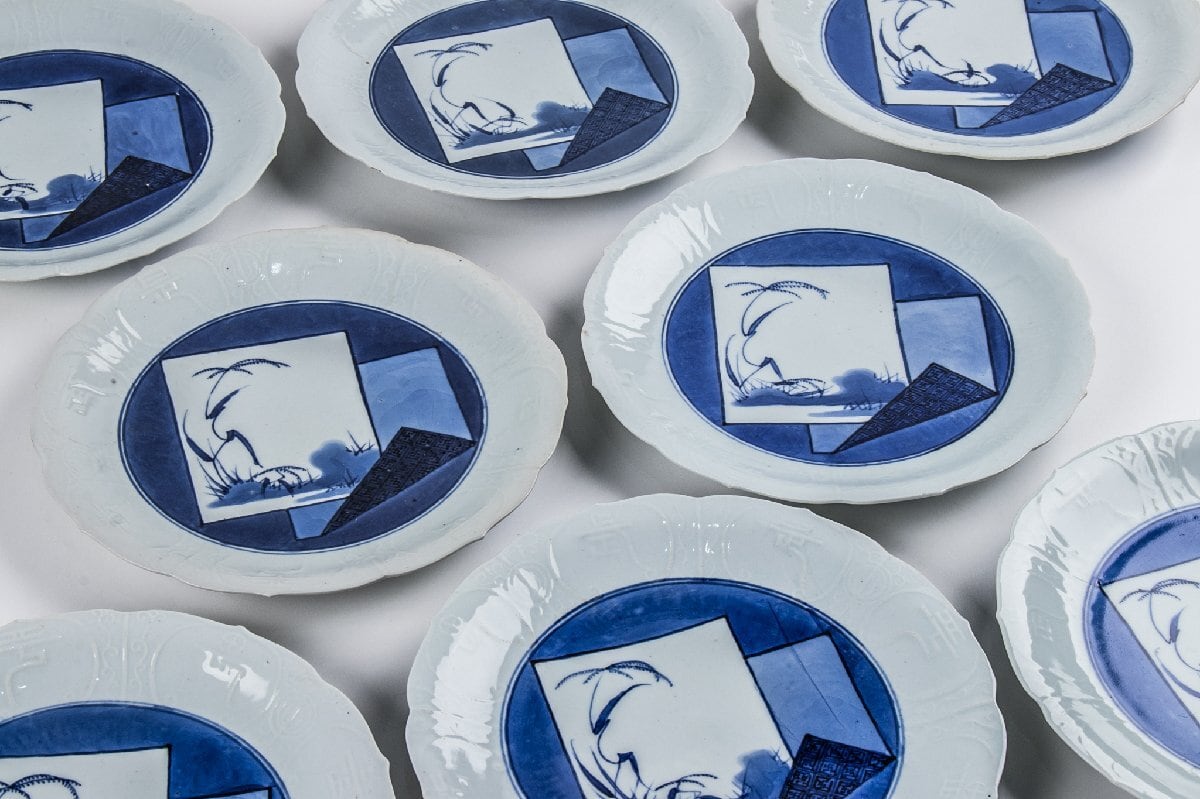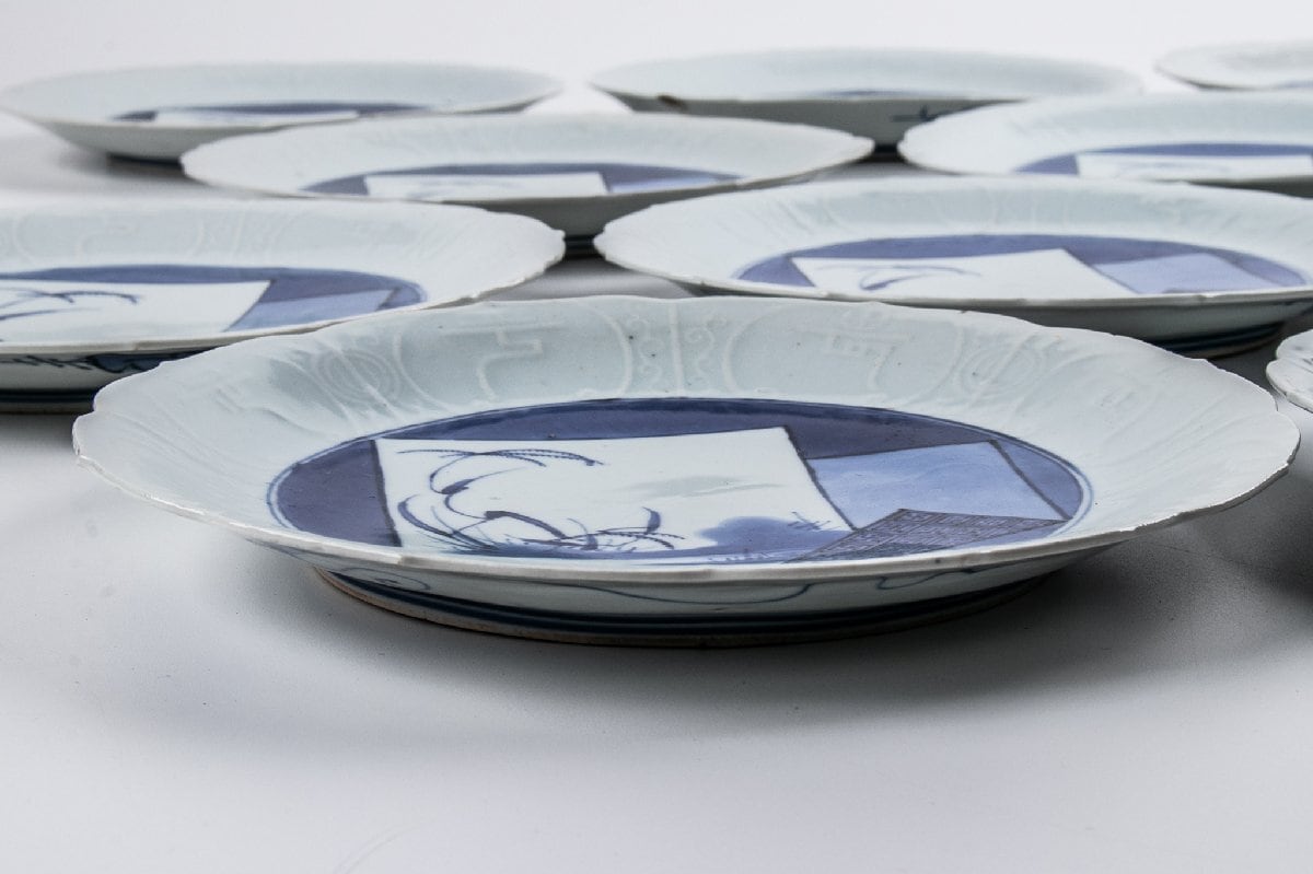 藍九谷 染付色紙文縁陽刻輪花 七寸皿 10客 箱付 江戸前期 F383A