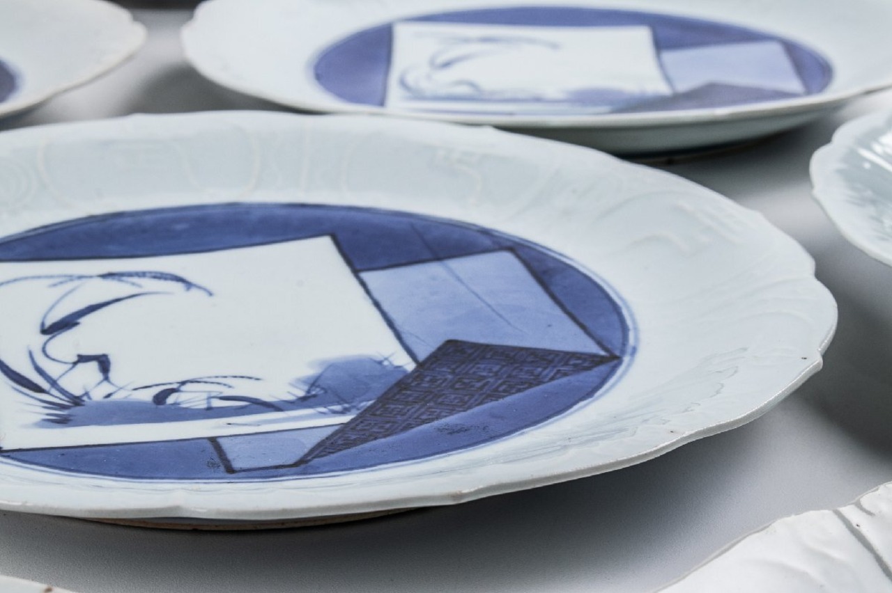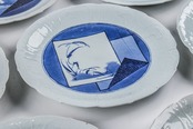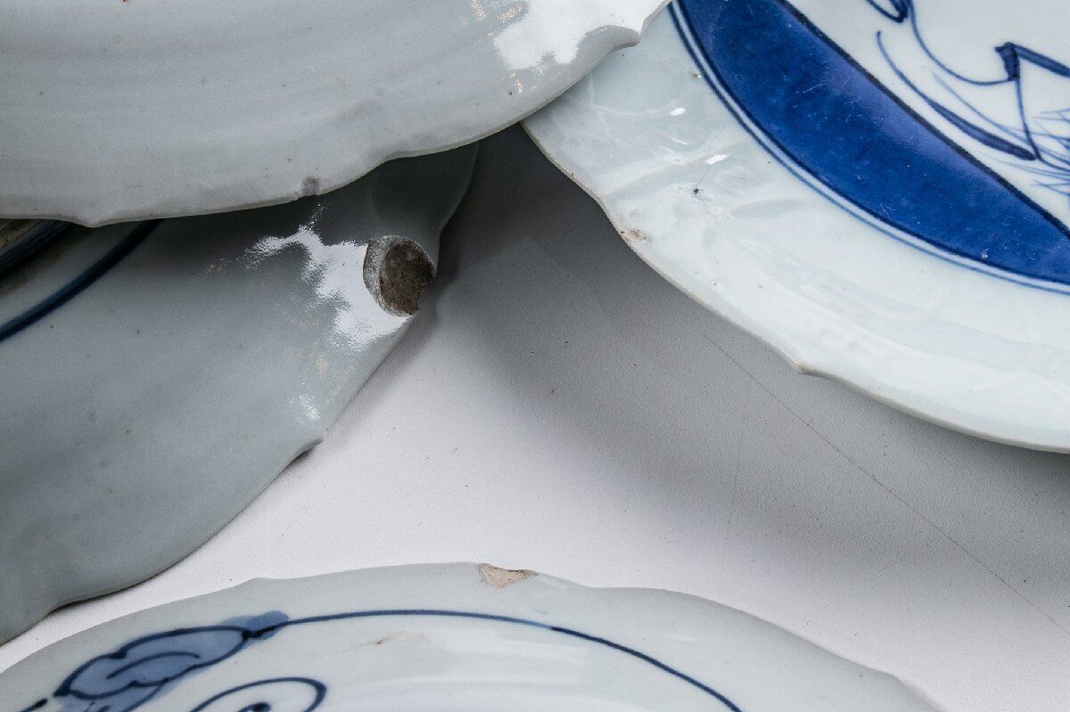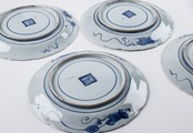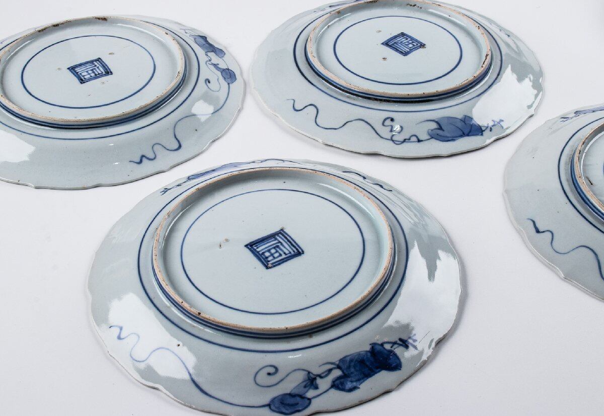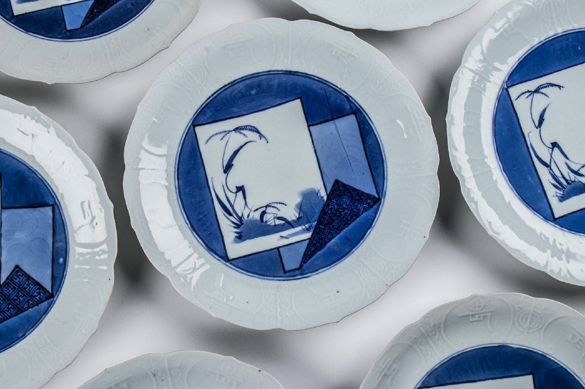 藍九谷 染付色紙文縁陽刻輪花 七寸皿 10客 箱付 江戸前期 F383A