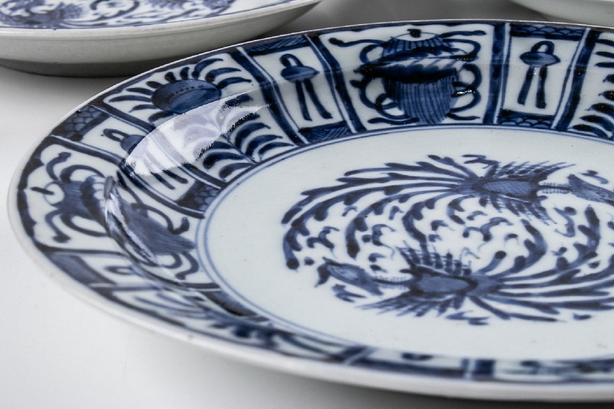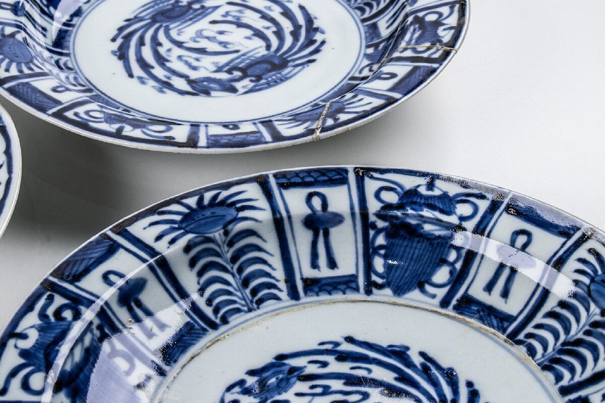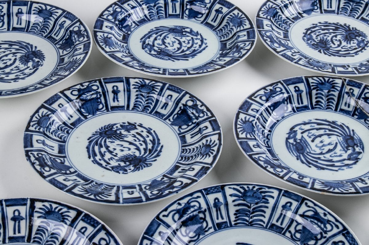 古伊万里 染付芙蓉手鳳凰文 七寸皿 9客 箱付 江戸後期 F502