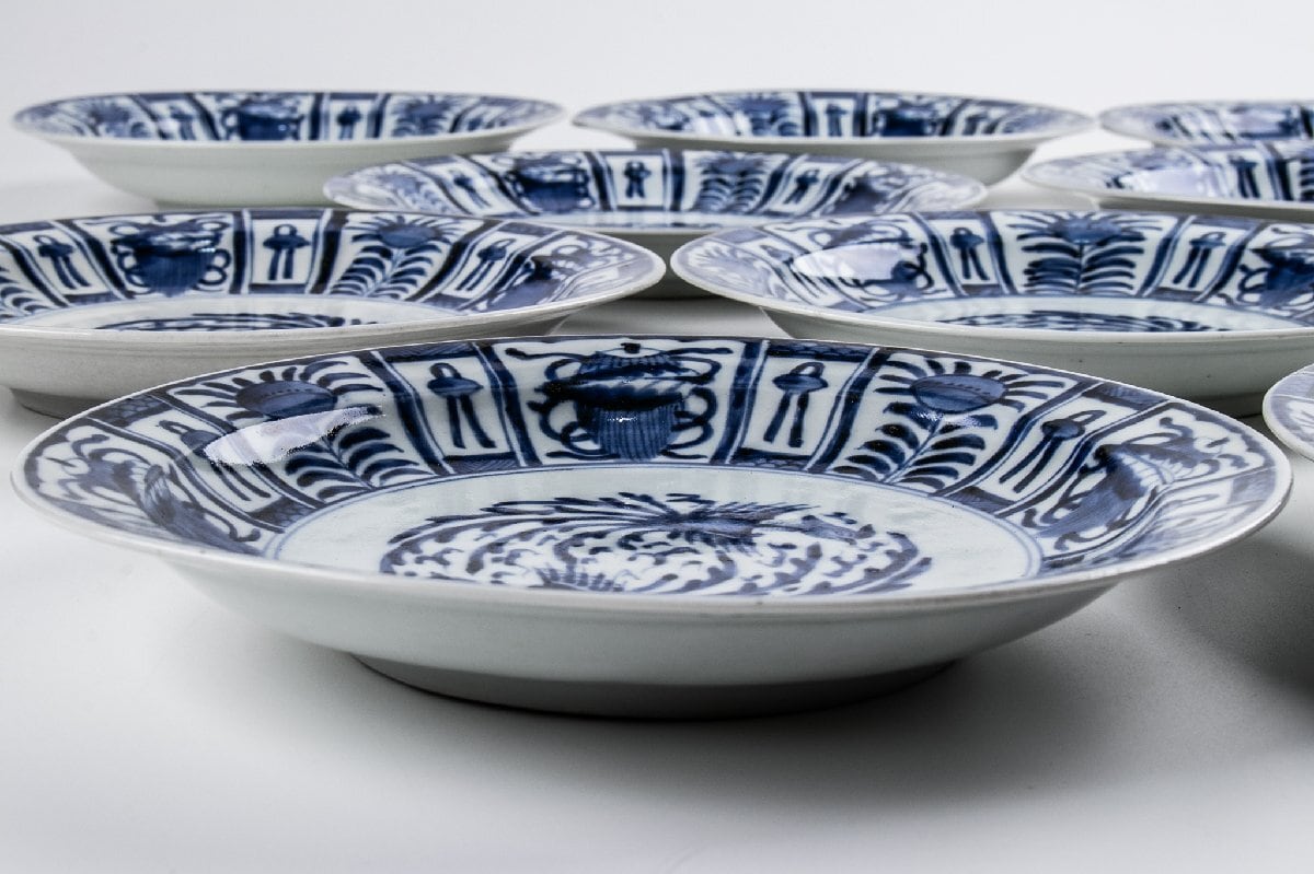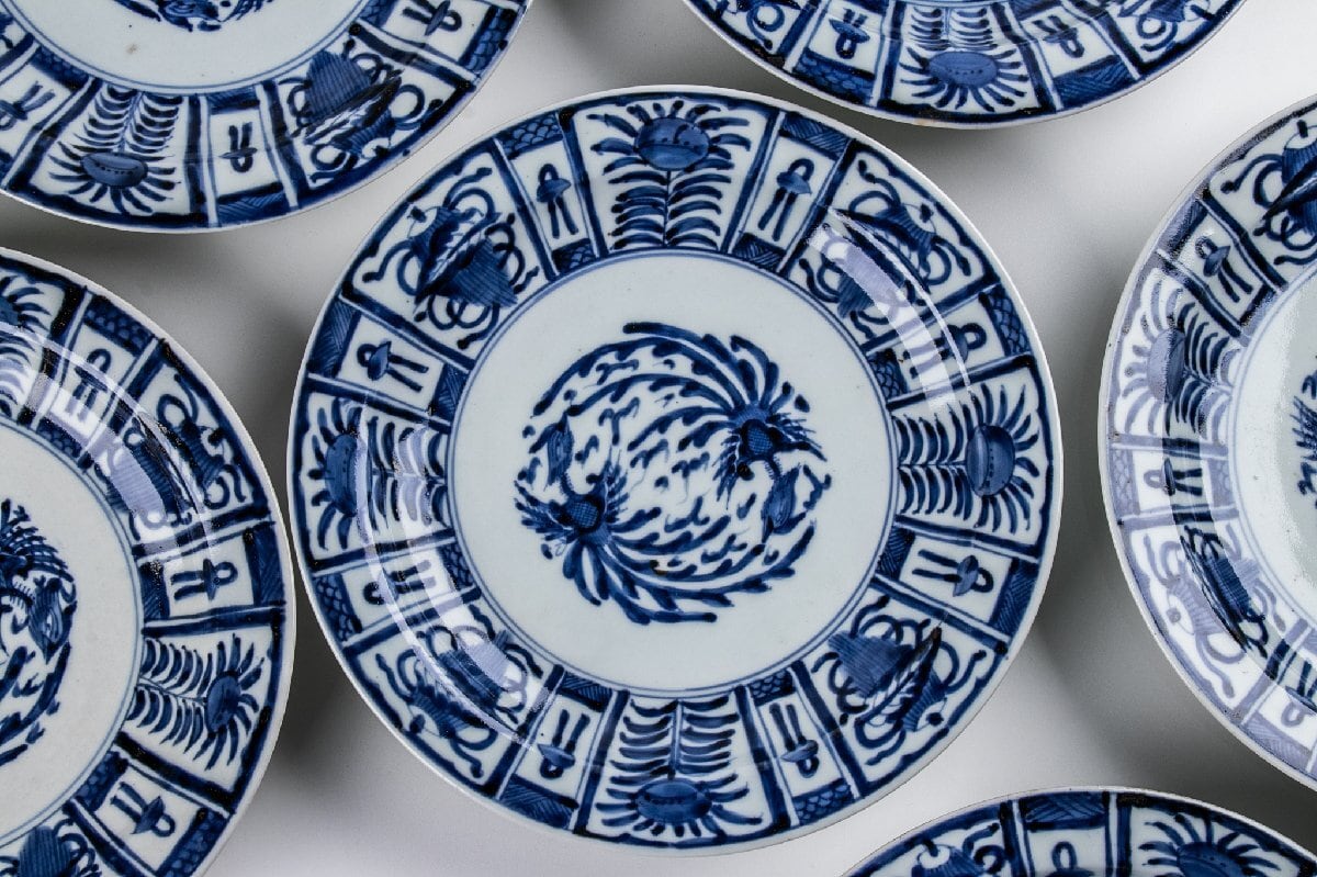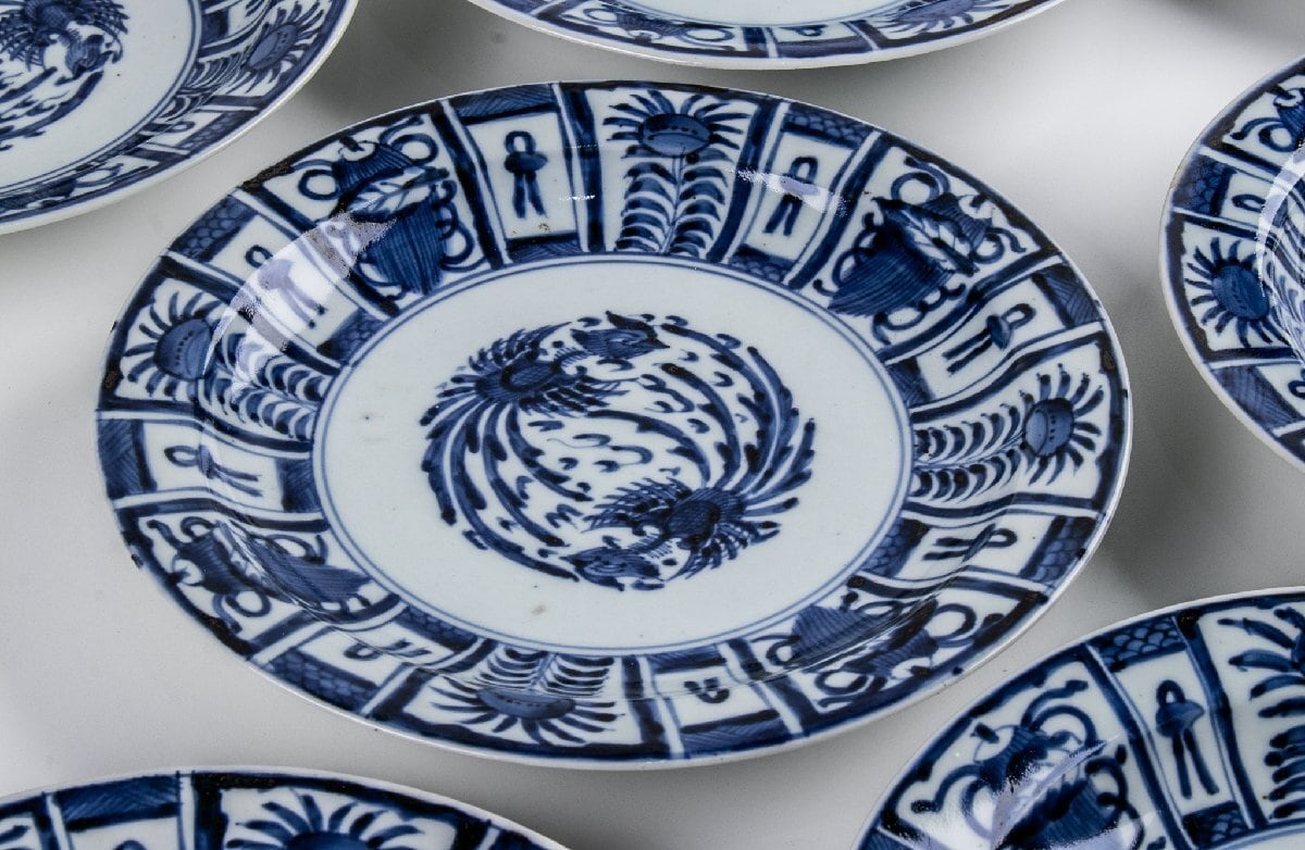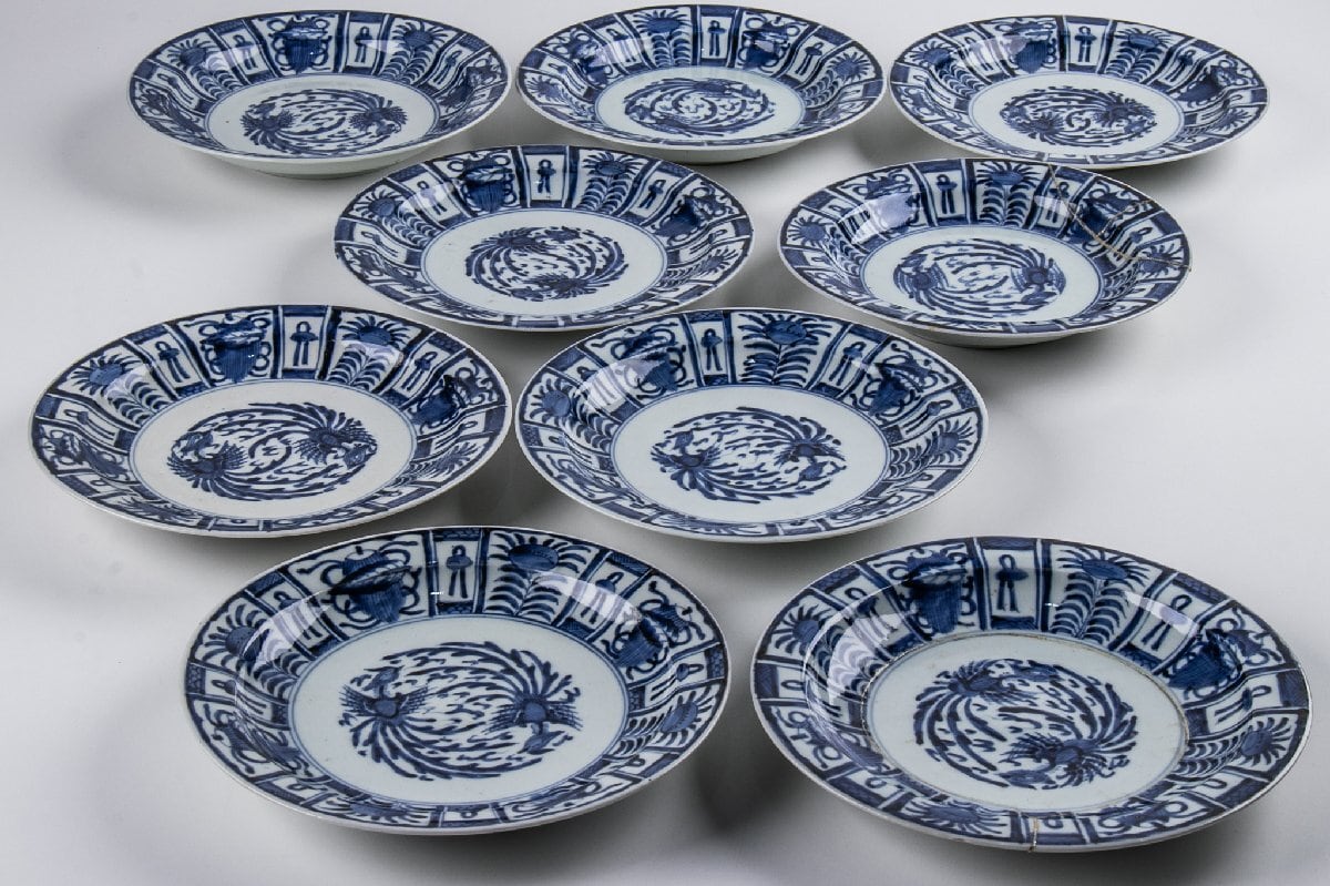 古伊万里 染付芙蓉手鳳凰文 七寸皿 9客 箱付 江戸後期 F502