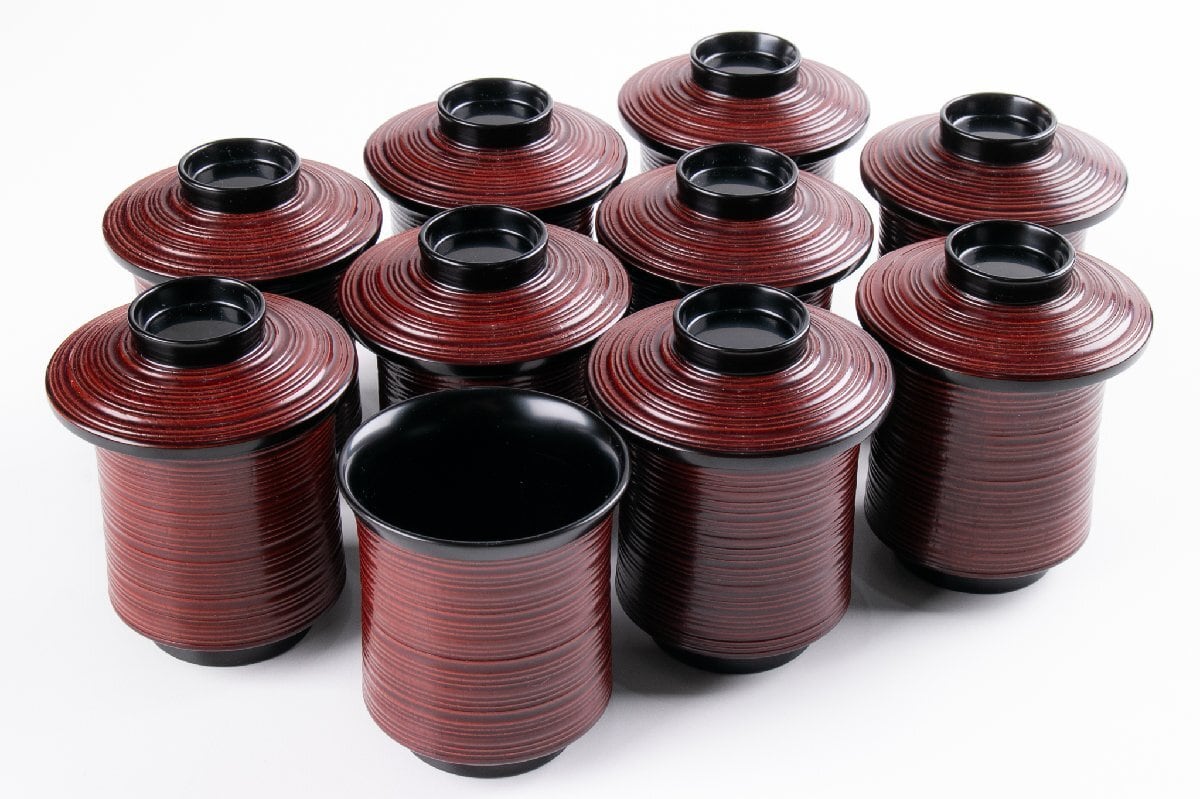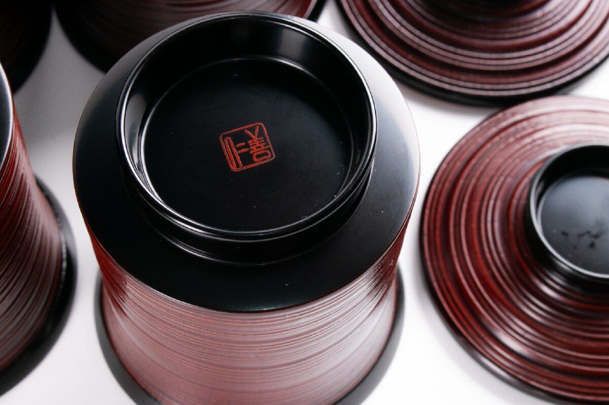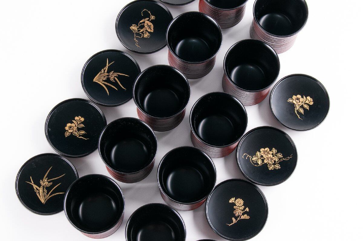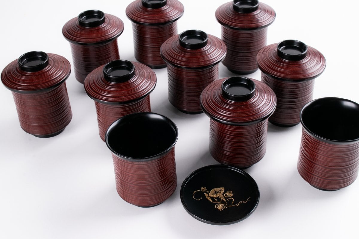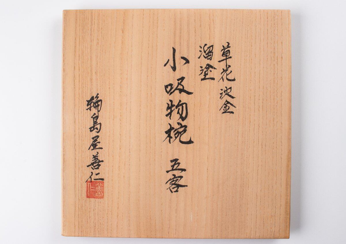 輪島屋善仁 溜塗 草花沈金蒔絵 小吸物椀 9客 共箱 F530