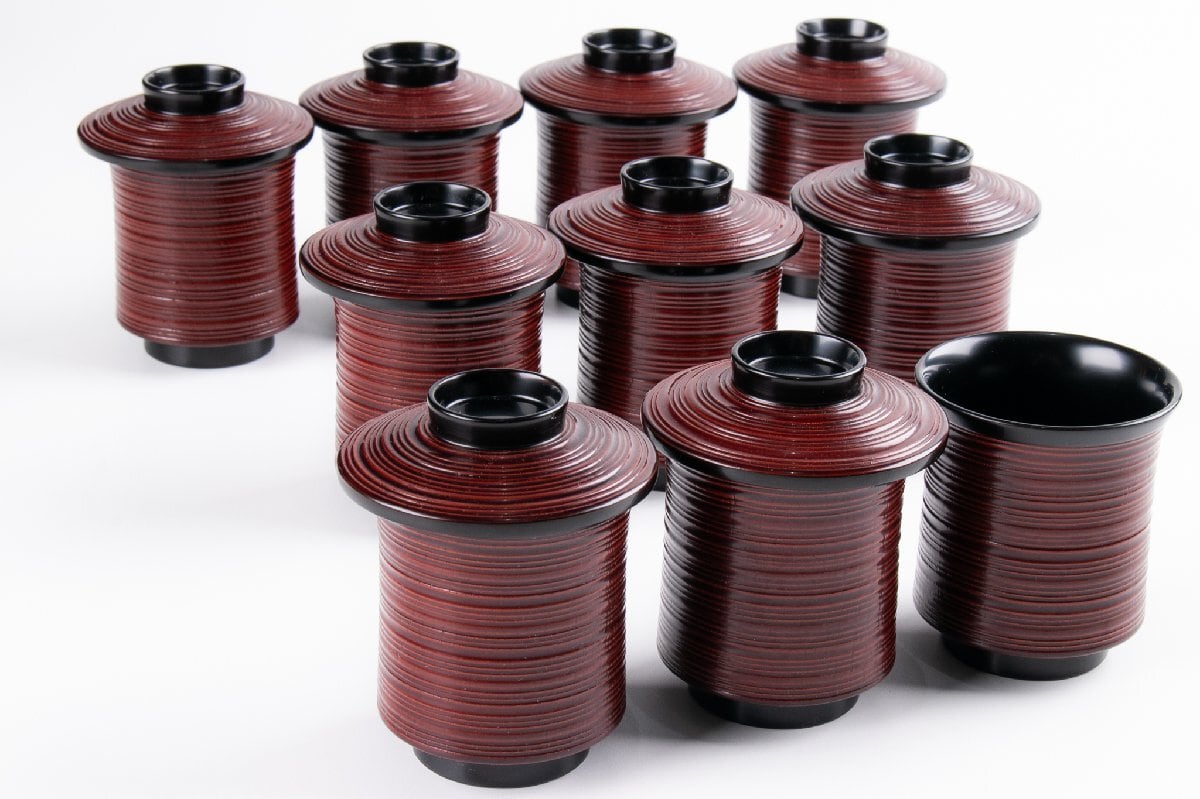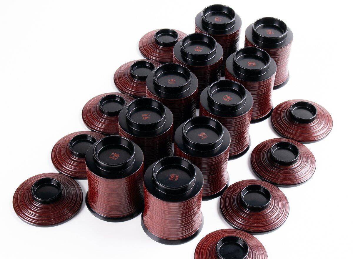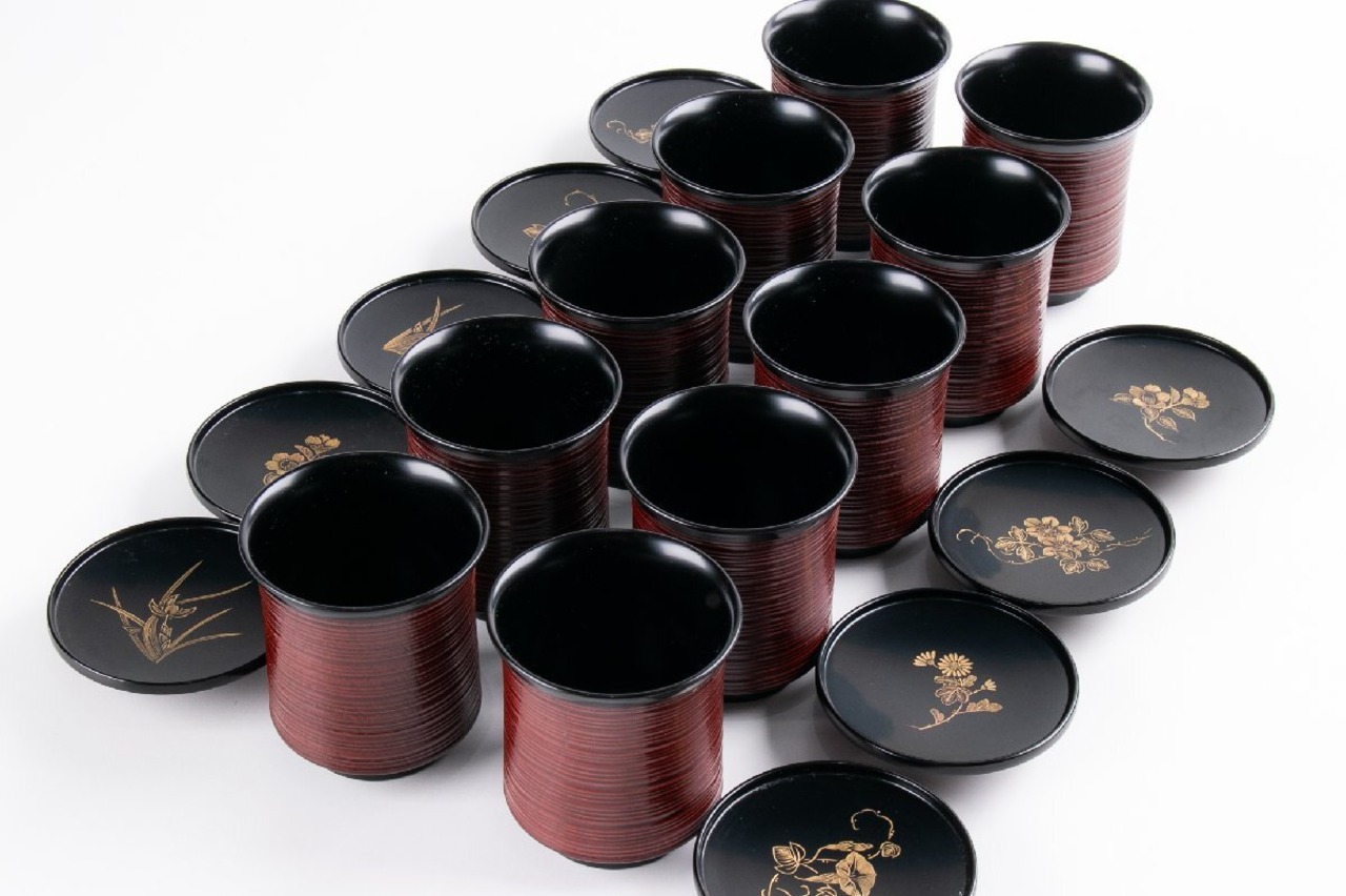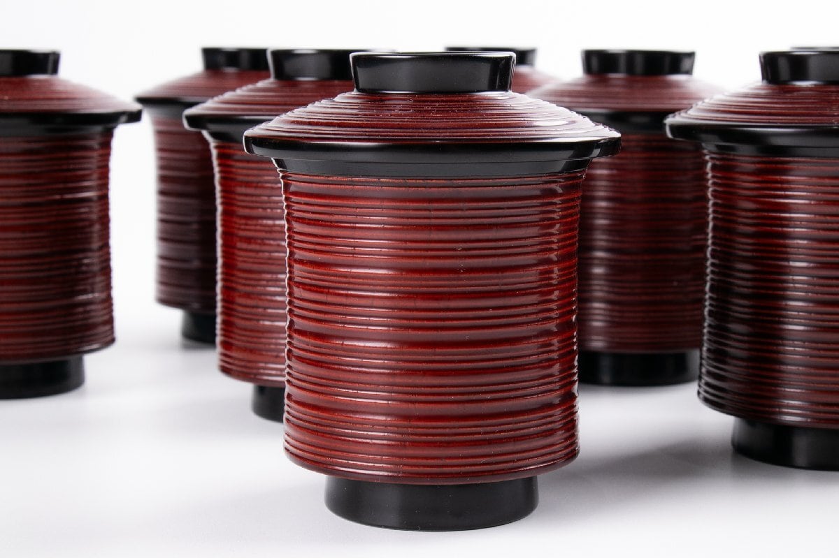 輪島屋善仁 溜塗 草花沈金蒔絵 小吸物椀 9客 共箱 F530