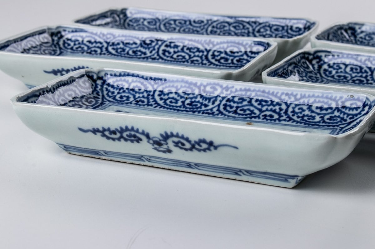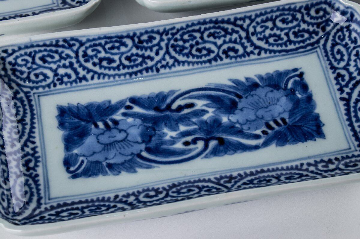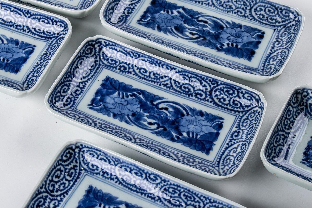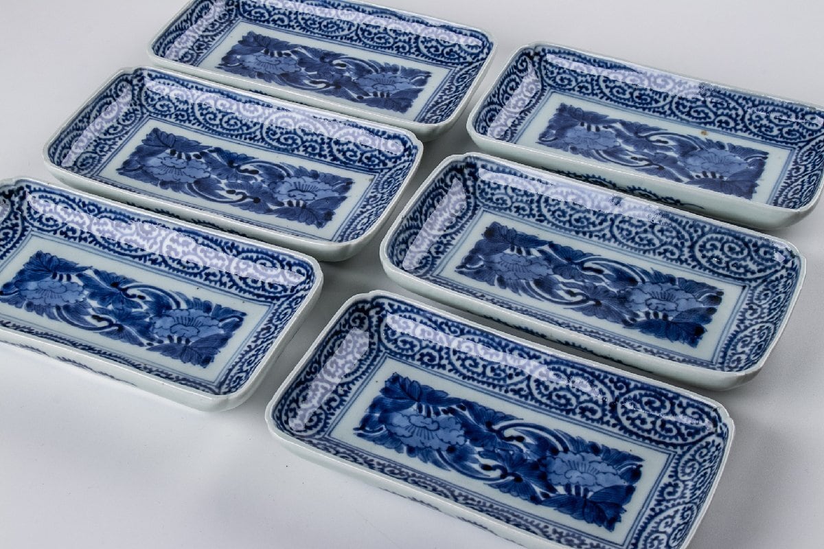 古伊万里 染付蛸唐草牡丹文長皿 6客 江戸後期 F564B バラ売り可能です